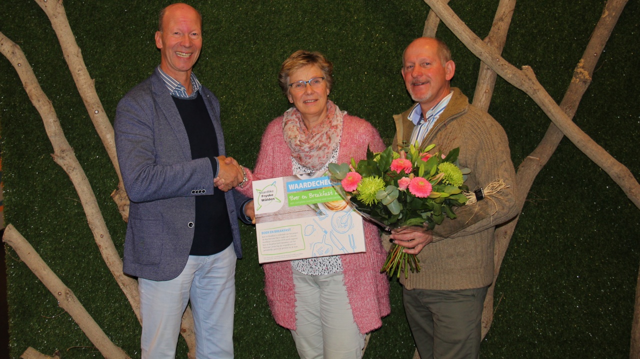 De uitreiking van de prijs vond plaats in het Kennis- en Innovatiehuis Noordoost Fryslân in Buitenpost, waar ook de NFW een kantoor heeft. Sape van der Wal en Pietsy van der Wal-Wijbenga uit Drachten ontvingen er uit handen van NFW-voorzitter Albert van der Ploeg een waardebon voor een volledig verzorgde overnachting voor twee personen tijdens Boer & Breakfast 2018. Zij hebben deze cheque gewonnen door deelname aan een prijsvraag tijdens het evenement Brommels! afgelopen augustus.