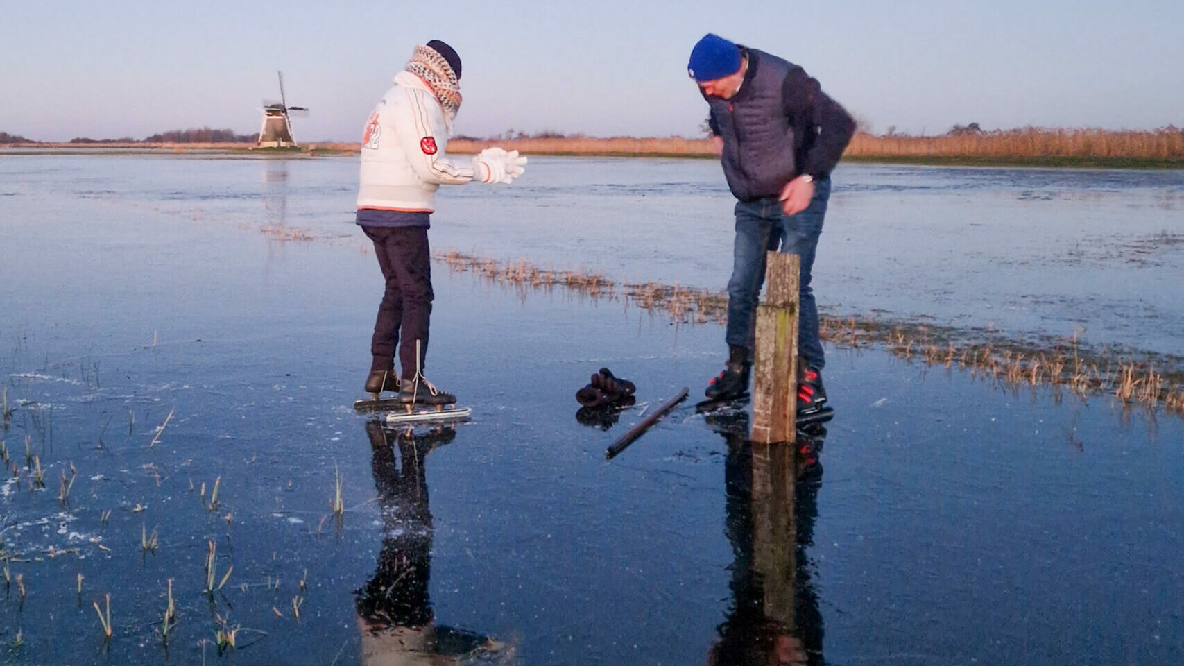 De mannen die er vrijdag vroeg bij waren, hebben gemeten of het wel betrouwbaar was. Al voor de zon op was, stonden de eerste schaatsers op het ijs. “Er zit geen beweging in het ijs, dus dat betekent dat het minstens 2,5 centimeter dik is. Het is nog steviger dan ik dacht. Meestal raakt het wel een beetje, maar zelfs dat doet het niet”, zegt een man. De walkant ligt intussen vol met boodschappentassen, schoenen, krukjes en thermosflessen.