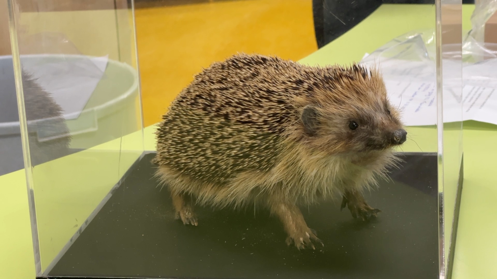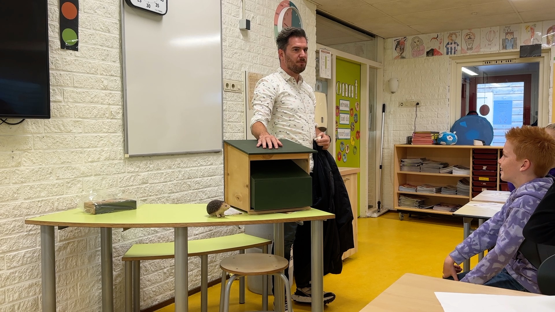 Yvonne de Beer van De Klyster legt uit wat je moet doen als je een egel tegenkomt:“Se kinne him wat helpe om kattefoer mei pikemaak te jaan en wat wetter, gjin molke, mar wetter.” De gemeenten willen de egel graag helpen en geven daarom een egelhuisje en een voederbak cadeau. “Wy hawwe in húske, eigen in egelhûske, en dêr giet de stikelbarch hurder hinne as gewoan yn ‘e tún,” vertelt Hannah uit groep 7.