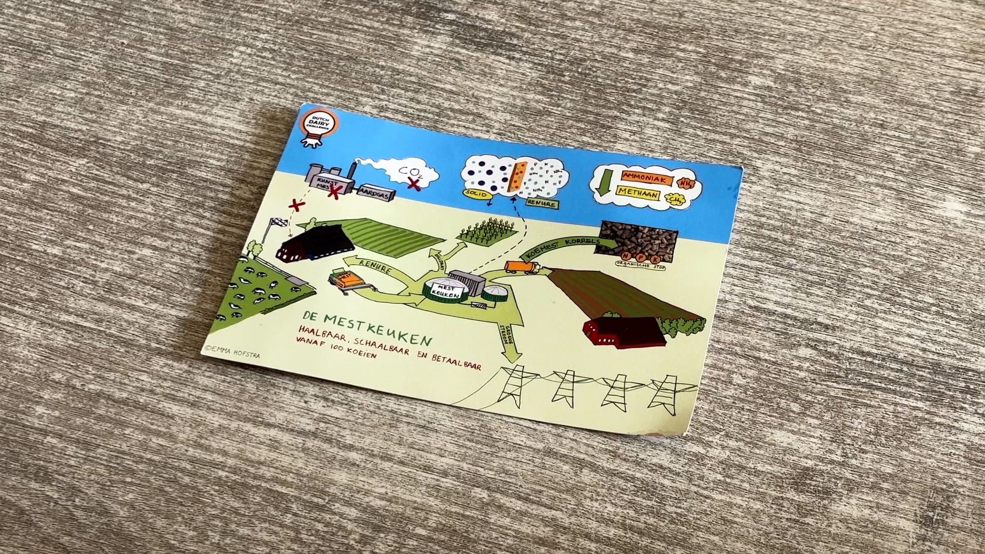 De melkveehouder heeft tijdens de Dutch Dairy Challenge de publieksprijs gewonnen met de mestkeuken op eigen terrein. “Je krije in dongferwurkingsynstallaasje op it hiem, dêryn wurdt de mest fergiste. Fan it gas wat dêr by frijkomt kin griene stroom opwekt wurde. De dikke fraksje, digestaat en renure dy’t oerbliuwe kinne allegear op eigen lân brûkt wurde, as folle konsintrearder ferkocht wurde oan oare lânbewurkers.”