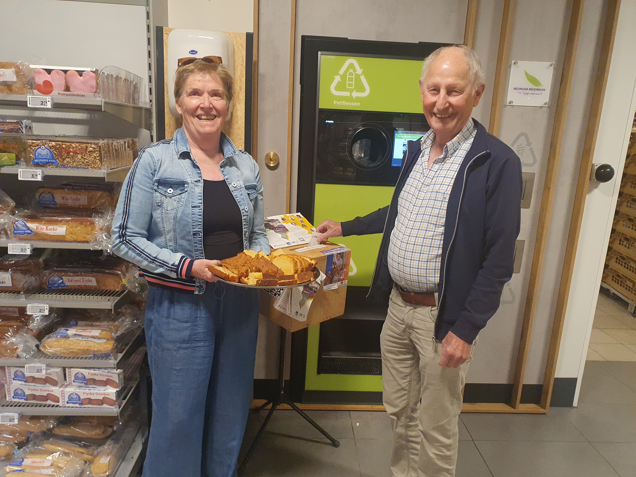 BURGUM – Vrijdag was een feestelijk moment voor Stichting Help Mij Leven (HML) en supermarkt Plus Wolters. Dankzij klanten en medewerkers is de opbrengst van de gedoneerde emballagebonnen de grens van duizend euro gepasseerd. De laatste bonnen werden ingewisseld voor geld, en als dank kregen de medewerkers en klanten van Plus Wolters een plakje zelfgebakken cake aangeboden door leden van de werkgroep.