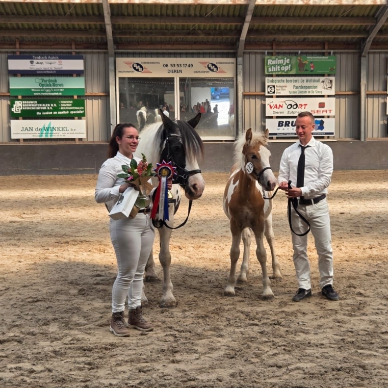 Alsof de kampioenstitel nog niet genoeg was, kreeg Henderike de Jong nog een bijzondere prijs: ze werd benoemd tot Fokker van het Jaar 2025 en ontving de bijbehorende fokkerspremie. “Ik ben zo trots op Ender en dit moment!” zei Henderike stralend na afloop. De centrale keuring was een feest van talent en passie voor de Tinker-fokkerij. Ender Moonshine en Henderike de Jong hebben laten zien wat ze in huis hebben.