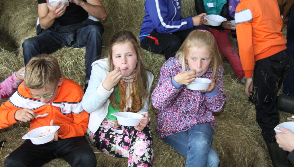 Ten slotte hebben de leerlingen verschillende soorten yoghurt (gemaakt op de boerderij) geproefd en moesten ze de smaak raden. Uiteraard viel de chocoladeyoghurt het meest in de smaak.. Na het maken van een groepsfoto, mocht de winnaar van de speurtocht de lammetjes een fles melk geven. Als afsluiting kregen de leerlingen nog wat lekkers, waarna we weer terug naar school gefietst zijn. De leerlingen vonden het erg leuk en het was een geslaagde, leuke en leerzame middag!