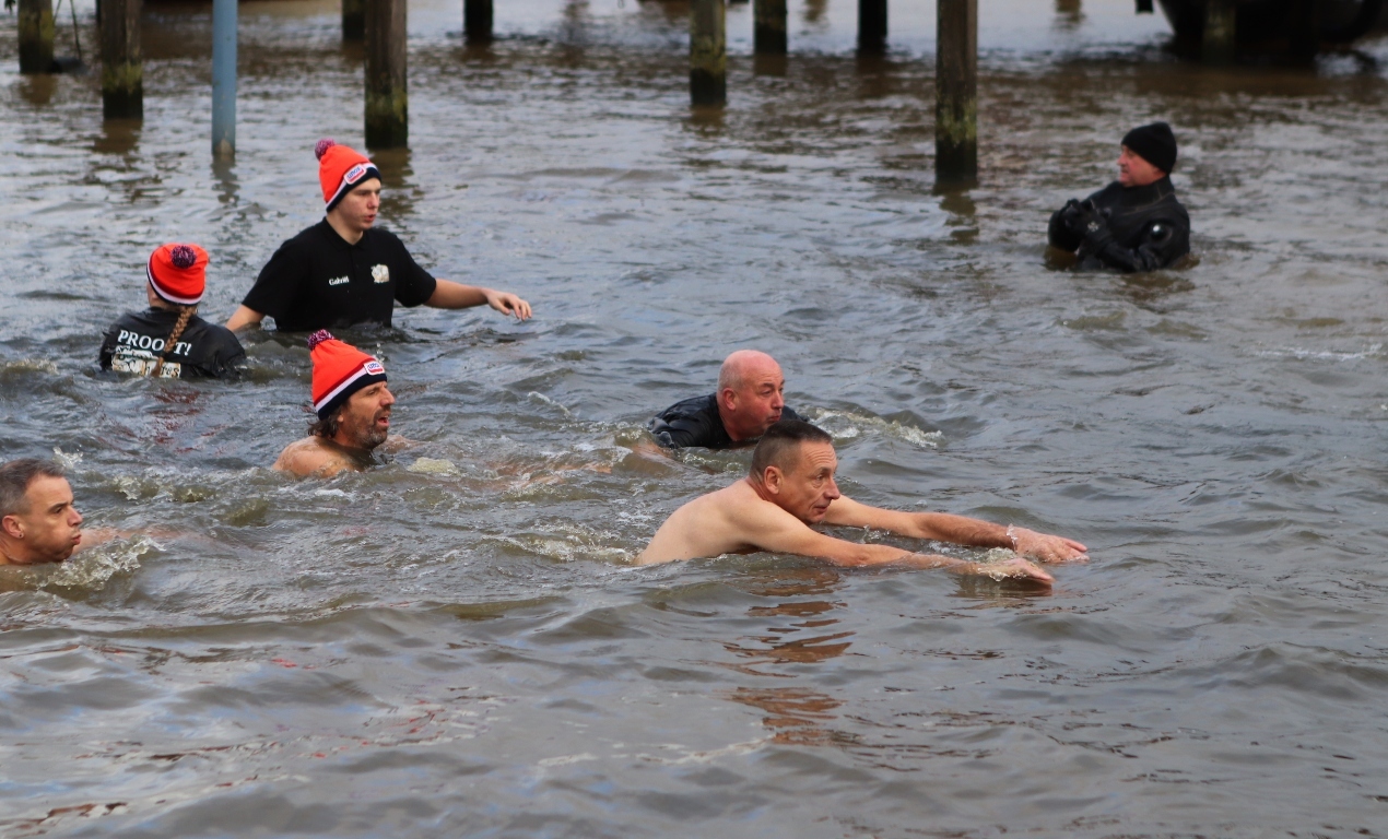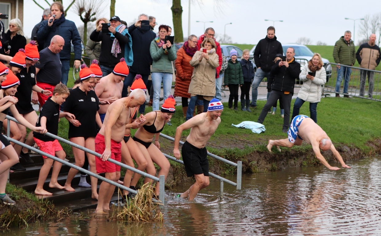 BURUM – De Nieuwjaarsduik in Burum vond in haven ‘De Dwinger’ aan de Meerpaal plaats. Het startschot werd gelost door burgemeester Johannes Kramer, die hiervoor zijn medewerking spontaan had toegezegd. Het was hem vorig jaar zo goed bevallen, dat hij wederom graag dit bijzondere gebeuren in Burum weer wilde meemaken.