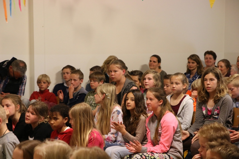 Maar liefst dertig Schoolschrijvers, dertig basisscholen, 11 gemeentes in 3 provincies doen hier aan mee in schooljaar 2014-2015. Dit bereikte 6000 leerlingen én hun ouders en leerkrachten. Kinderen uit de groepen 5, 6, 7 en 8 mochten vanmiddag wat van hun schriftelijke en mondelinge taligheid laten zien aan uitgenodigde ouders. De ouders kunnen zo een impressie krijgen van wat er aan de orde is geweest in de vier maanden dat de schoolschrijvers betrokken zijn geweest als taalstimulators aan de Stapstien. Zo waren er gedichten, eigen gemaakte verhalen, taal- en raadspelletjes. Door Minne van Wieren was een korte film gemaakt met een impressie van de activiteiten van de schoolschrijvers in de verschillende groepen.