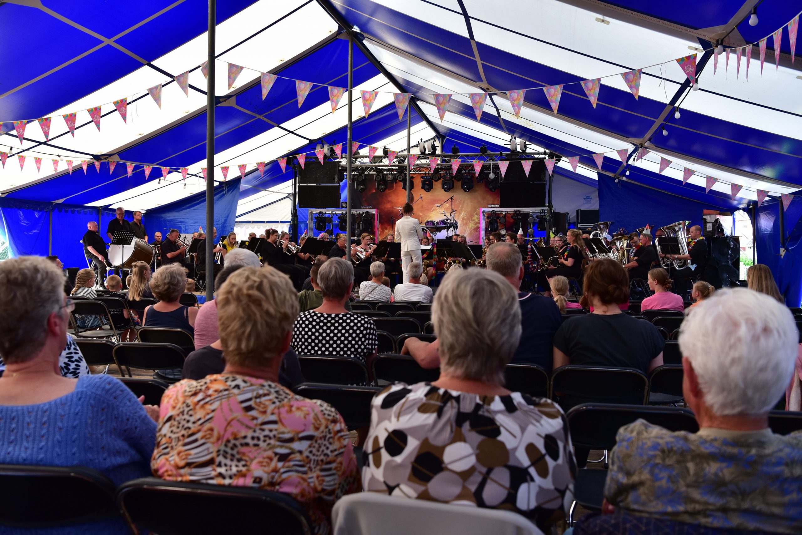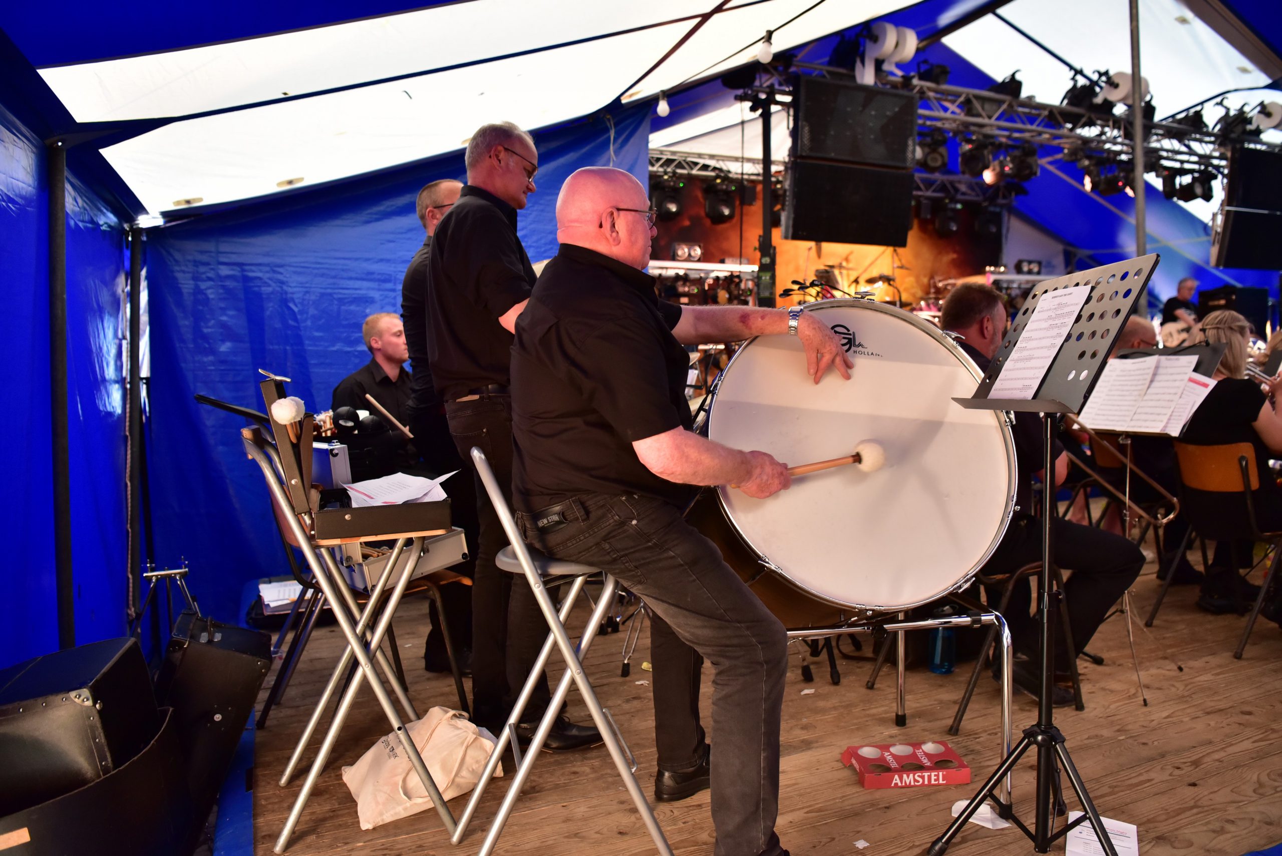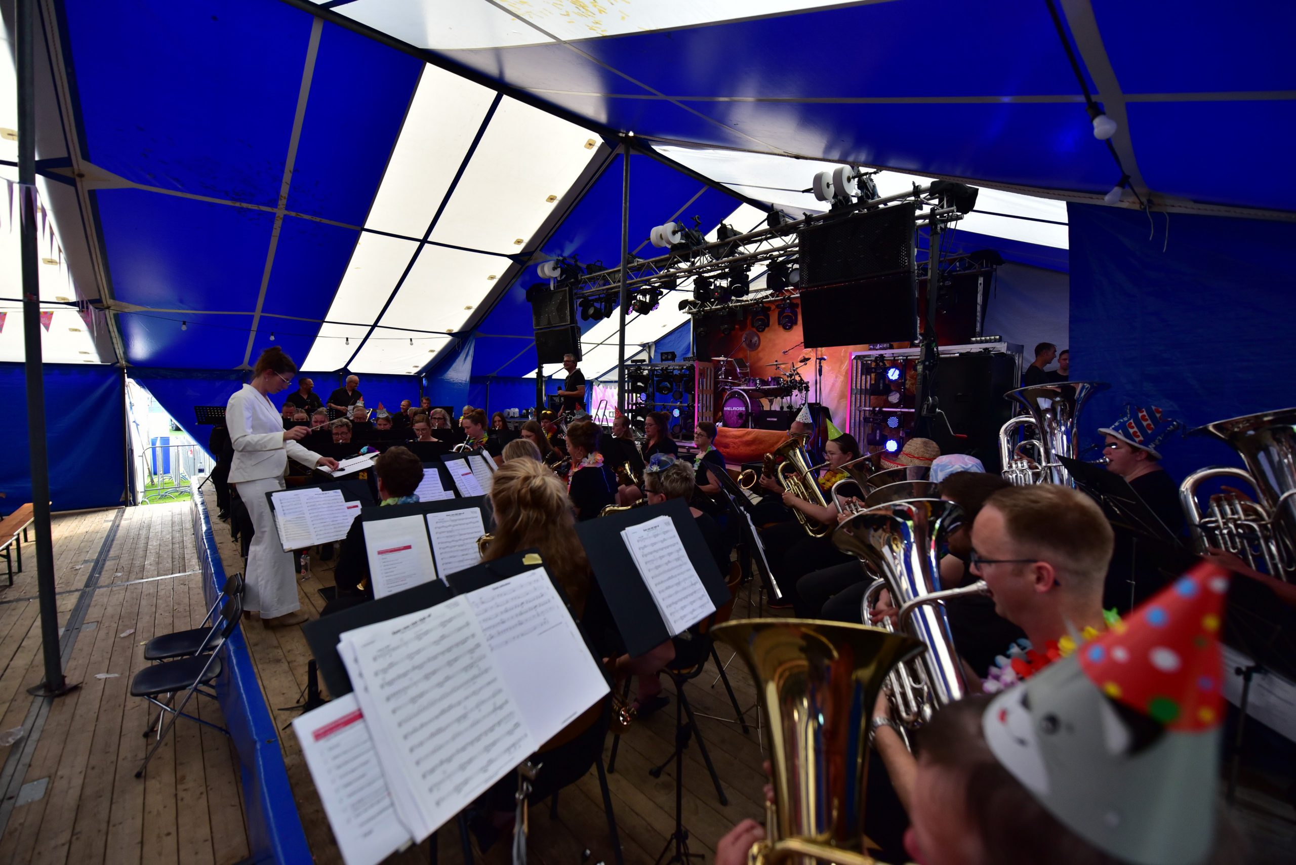 Vrijdagavond lieten de beide fanfares van zich horen tijdens het Holwerter Music Night. De beide korpsen, De Bazuin en Crescendo bezetten met 60 deelnemers een groot deel van het extra podium in de feesttent. Met een muzikale mix van pop, rock en Nederlandstalig wist Dieuwke Kloppenburg tent in beweging te brengen met onder andere ‘Kom van dat Dak af’ You never walk alone en Narcotic. Daarbij werden ze geholpen door de band Melrose die deze en andere nummers gezamenlijk met de fanfares ten gehore brachten. Melrose on tour verzorgde daarna nog een spetterend concert.