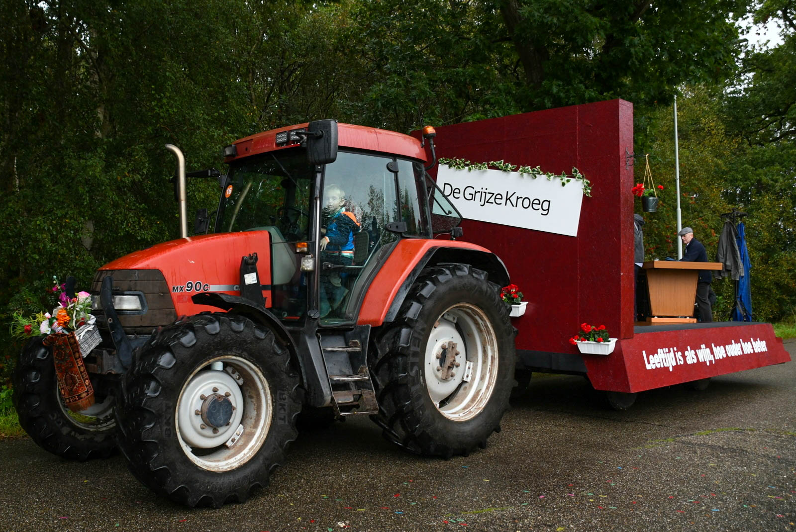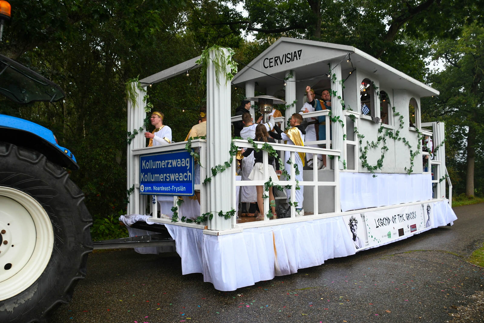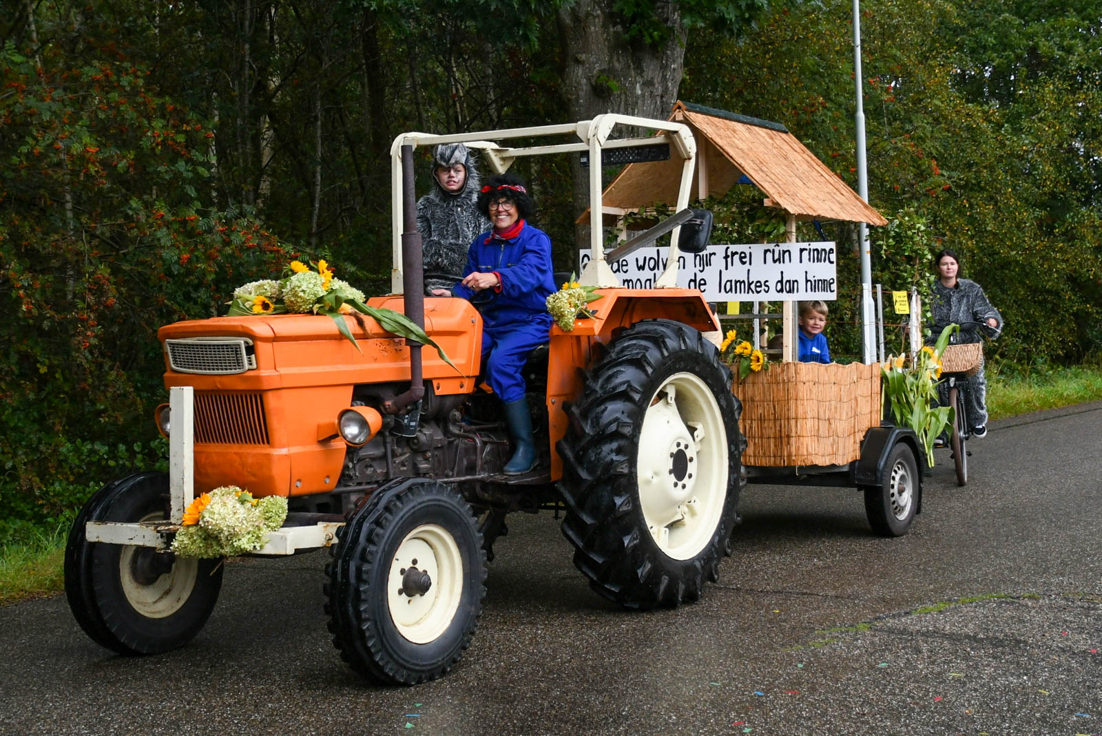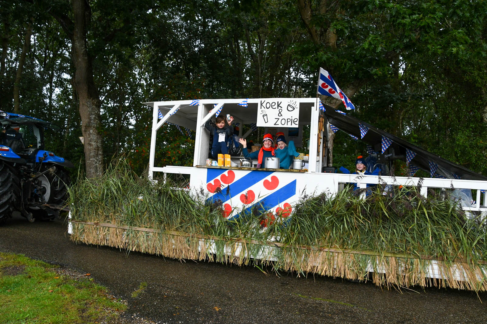 KOLLUMERSWEACH – De optocht, voor velen hét hoogtepunt van de feestweek in Kollumersweach, zorgde ook dit jaar voor een kleurrijk spektakel. Maar liefst 59 prachtig versierde wagens en tal van vrolijke fietsers reden mee, ondanks het wisselvallige weer dat af en toe voor een flinke bui zorgde.