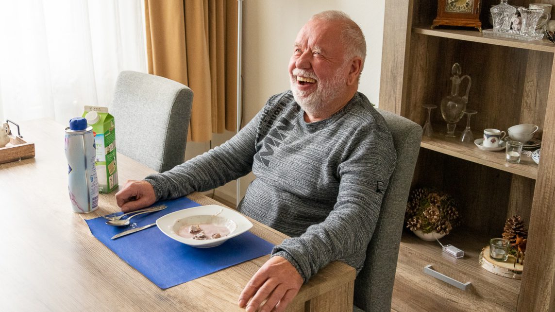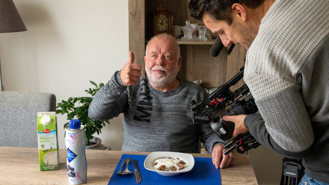 Vrijdagochtend kwam een team van Man Bijt Hond naar Damwâld. Dit om Koos zijn vreemde eetgewoonte te filmen. Na de aardappelen en groente neemt hij een bord yoghurt. Dat is niet vreemd, maar door de yoghurt husselt hij vlees (wat in stukjes is gemaakt), plus nog wat ranja.