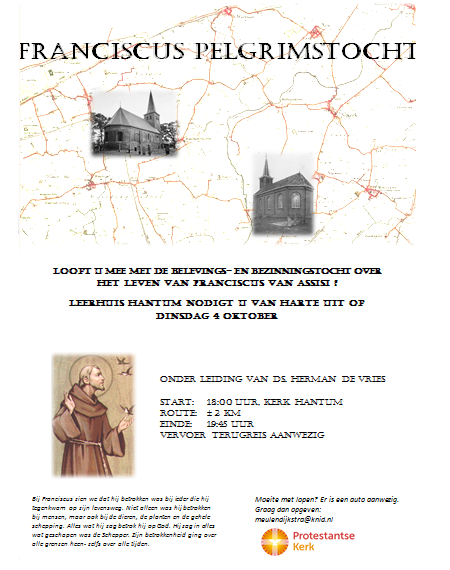 Op 4 oktober organiseert de Leerhuiscommissie van de Protestantse Gemeente Hantum een zgn. Franciscuspelgrimstocht. Op 4 oktober is Dierendag, maar ook de gedenkdag van Sint Franciscus.
