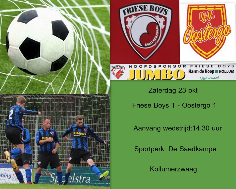KOLLUMERZWAAG – Zaterdag 23 oktober speelt Friese Boys 1 tegen Oostergo 1. Aanvang wedstrijd: 14.30 uur. Op sportpark: De Saedkampe te Kollumerzwaag.