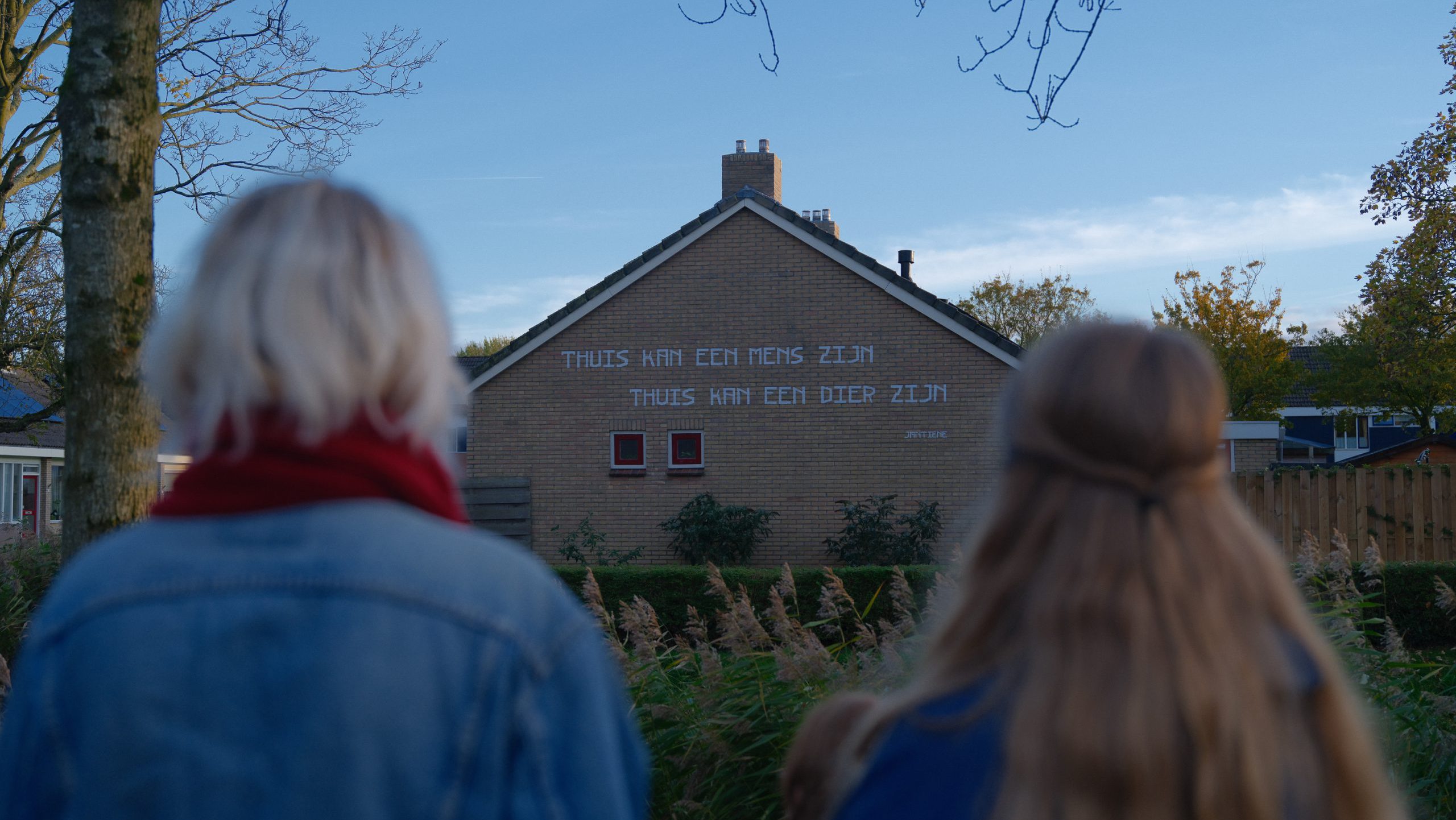 De zinnen in Dokkum zijn geen versiering, maar spiegels. Ze herinneren voorbijgangers eraan dat ieder huis een verhaal kan dragen en dat één enkele zin genoeg kan zijn om mensen dichter bij elkaar te brengen. Leonie van Thús Wonen hielp bij het vinden van geschikte woningen en betrokken bewoners. Janna Krul – van der Woude is één van de bewoners die haar huis beschikbaar stelde voor de muurschildering. “Ik wie fuortendaliks entûsjast, ik moast it fansels efkes oerlizze mei myn man en dy wie ek entûsjast om op dizze manier beweging yn de wyk te krijen en minsken mei-inoar prate te litten, wat fansels ek it doel is fan dit projekt.” De deelnemende huisbewoners kregen voorbeelden van de zinnen te zien en mochten zelf uitzoeken welke op muur zou komen te staan. Op het huis van Krul – van der Woude staat de zin: ‘Eltse dei wer nei it plak fan harren. Myn plak, ús plak.’ “Wy woene dizze sin graach op ús hûs ha, mar dy wie oarspronklik yn it Nederlânsk. Doe hawwe wy frege oft it ek yn it Frysk koe, omdat wy sels ek Frysk binne en dat mocht. Dus no stiet de Fryske sin by ús op ’t hûs”, zegt Janna.