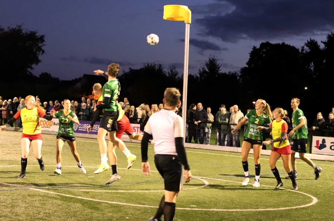 De DEVI-formatie uit Buitenpost, uitkomend in de overgangsklasse, trof met LDODK/Rinsma Modeplein een tegenstander van formaat: de club uit Gorredijk speelt op het hoogste landelijke niveau, de ereklasse. Toch lieten de Flamingo’s zich niet zomaar aan de kant zetten. In de eerste helft deden zij goed mee en waren zij bij vlagen gelijkwaardig aan de topclub. De spelers uit Buitenpost speelden met lef, gingen stevig de duels aan en scoorden regelmatig. Sterker nog: de thuisploeg kwam zelfs tweemaal op voorsprong.