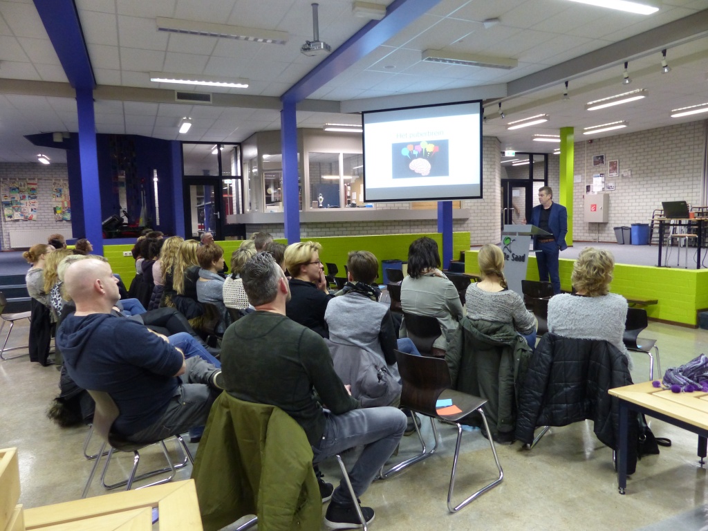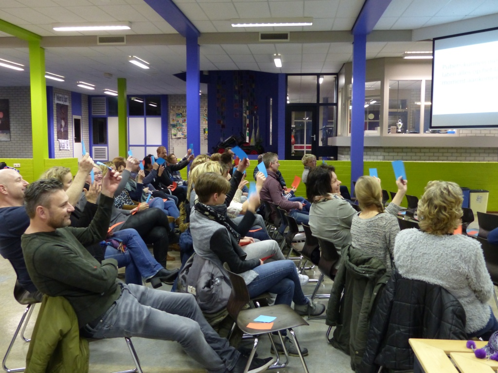 Grensoverschrijdend gedrag en ‘hoe werkt het puberbrein’ waren enkele thema’s waar deze avond over gesproken werd. Jeugdhulp en Fier gaven voorlichting en met een interactief programma konden de ouders vragen stellen, met elkaar in gesprek gaan en vooral van elkaar te leren. Ook werd er een spel gespeeld met stellingen, waarbij men een groene of een rode kaart kon tonen.