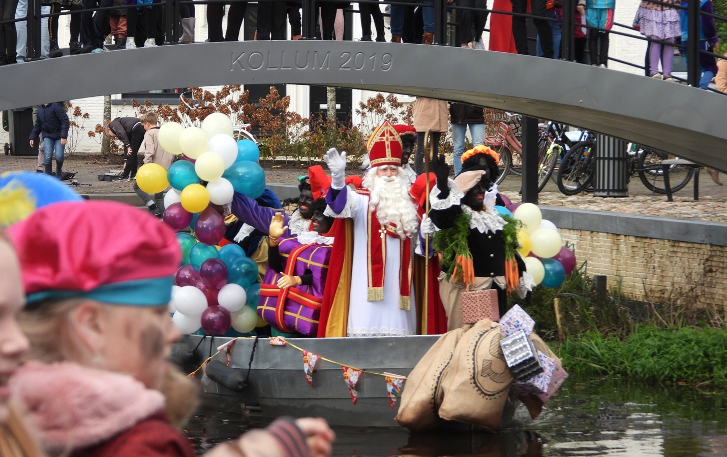 KOLLUM – Veel belangstelling op zaterdag 13 november bij de intocht van Sinterklaas met zijn pieten. Het gezelschap werd door de muzikanten van Chr. Brassband “Wilhelmina” binnen gehaald. De Sint met zijn pieten kwamen met de pakjesboot aan bij Wester- en Oosterdiepswal. Waar veel kinderen met de ouders de Sint met zijn pieten op stond te wachten. Ieder jaar is het weer een groot feest en voor de kinderen was het spannend.