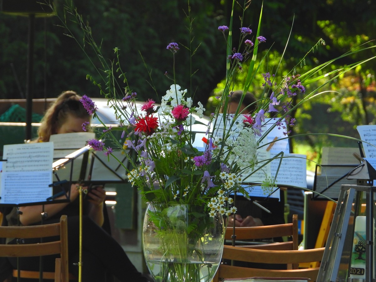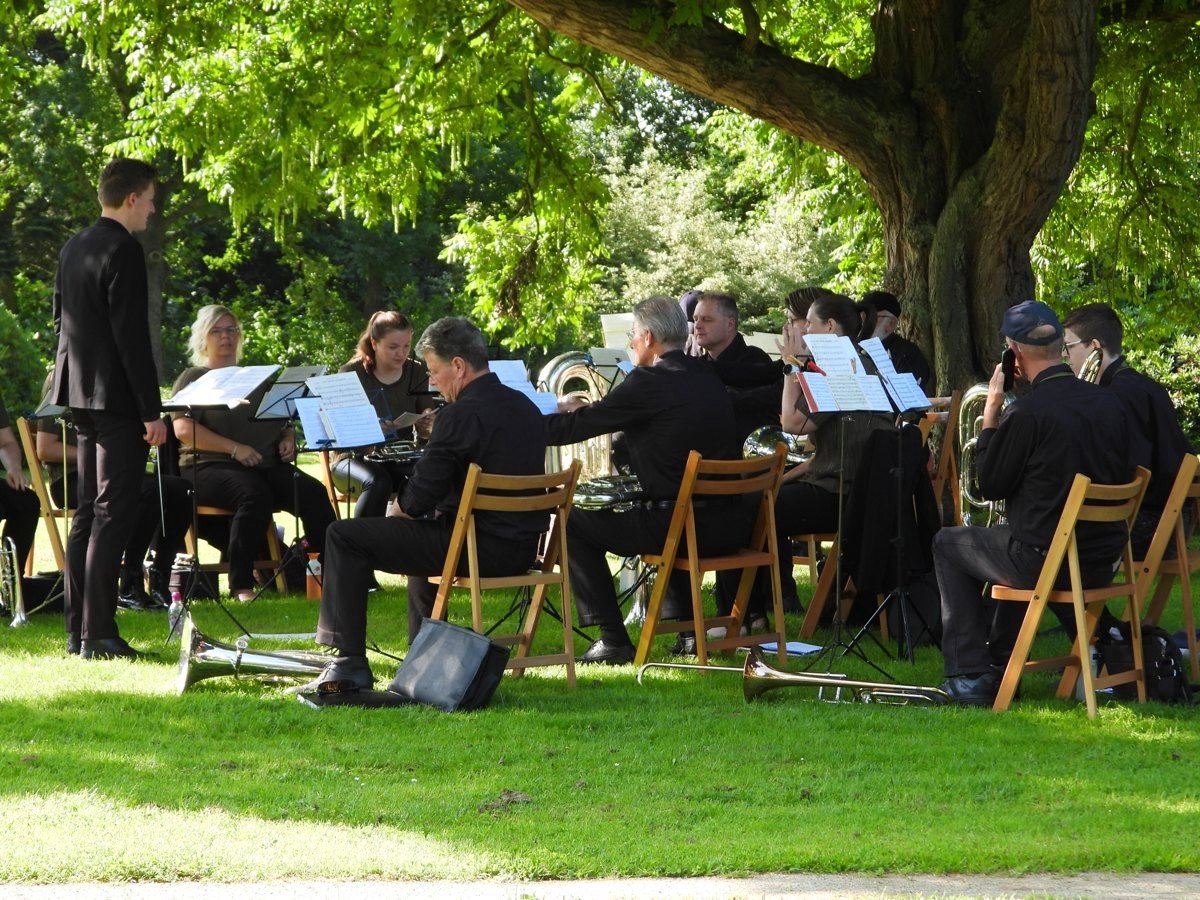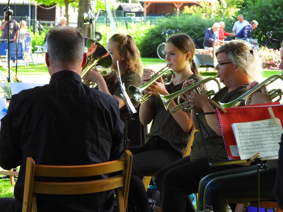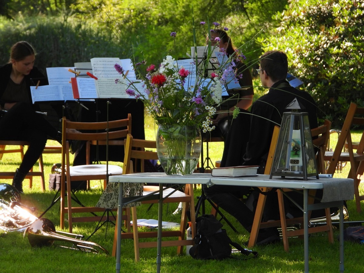 De muzikale begeleiding werd verzorgd door Chr. Brassband Wilhelmina uit Kollum. Onder een strak blauwe hemel was het een prachtige en vooral zonnige openluchtdienst. De liederen die er o.a. werden gezongen waren; Dank u voor deze nieuwe morgen, Prijst de Heer met blijde galmen en Welke vriend is onze Jezus, het slot lied is U zij de Glorie Voor de kinderen was er een kindernevendienst georganiseerd een puzzeltocht in het hertenkamp. Na afloop kon men nog even gezellig napraten onder genot van een bakje koffie of thee.