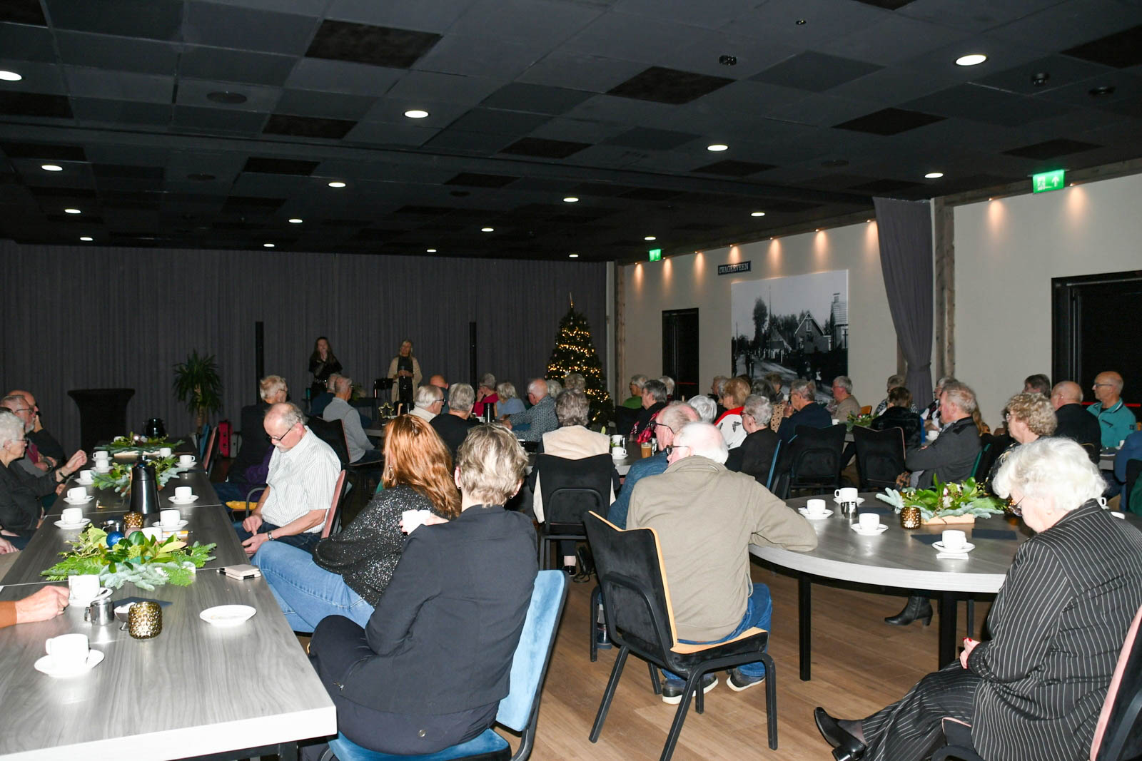 Ruim 60 mensen kwamen er op af, de meesten al in kerstkleding. Na een welkomstwoord van Arianne was het eerst aan het zangduo”de Shiners” om de spits af te bijten. Met een variatie aan meezingers, evergreens en kerstachtige liederen hadden ze de sfeer er al aardig in.