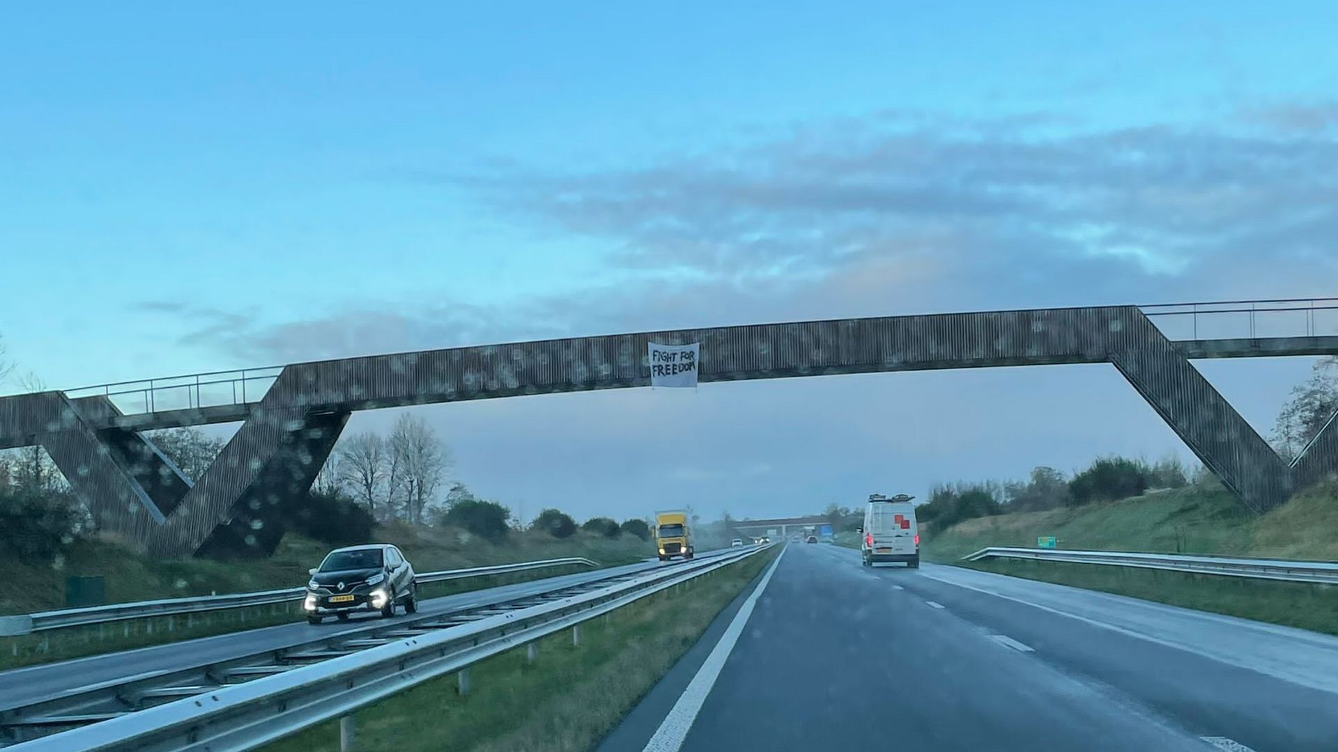 De route borden zijn vorig jaar oktober geplaatst in verband met de testlocatie van de GGD aan de Johannes Bogermanstraat in Kollum. Boven de Sintrale As is een spandoek gesignaleerd met de tekst: ‘Fight for Freedom’.