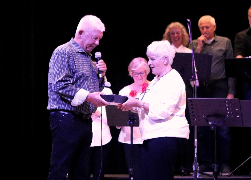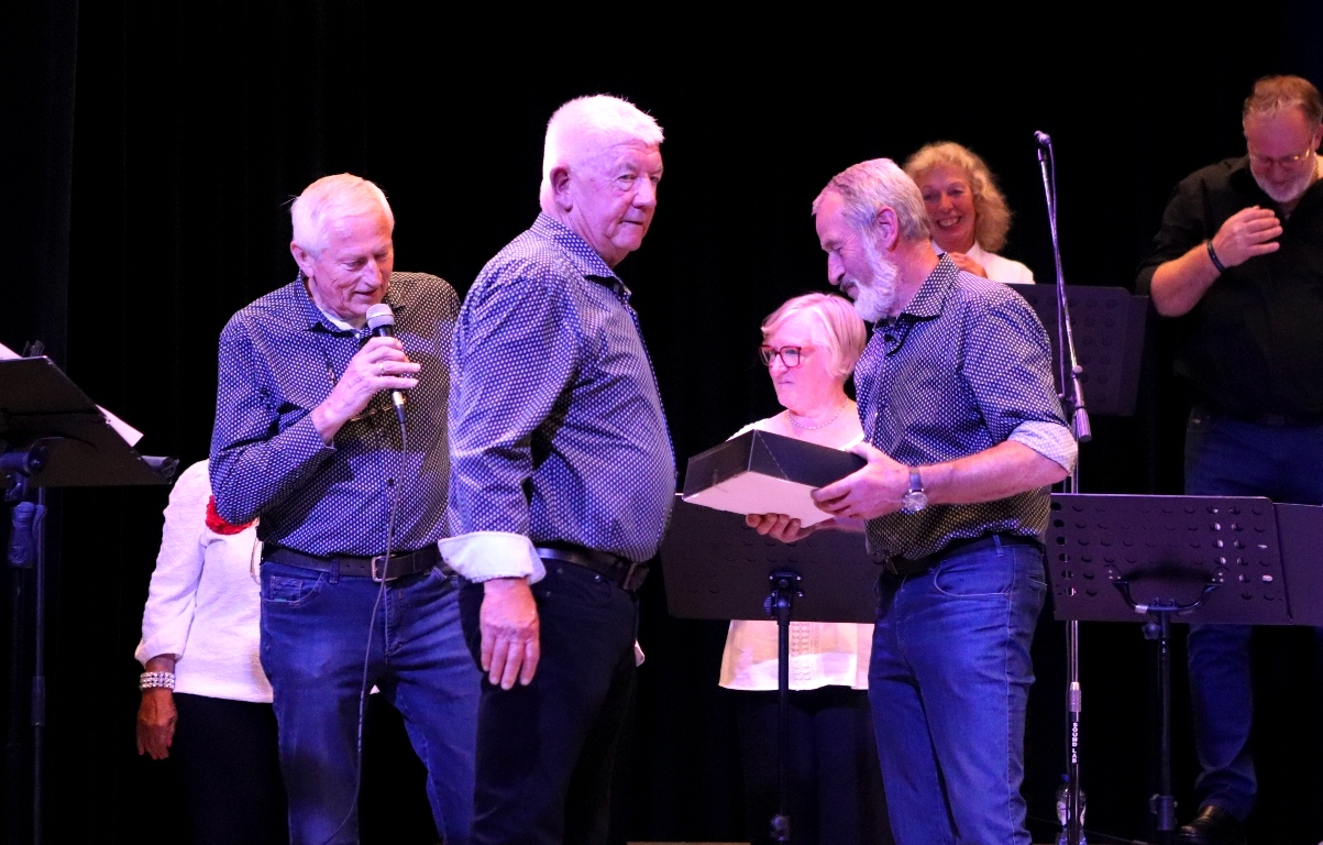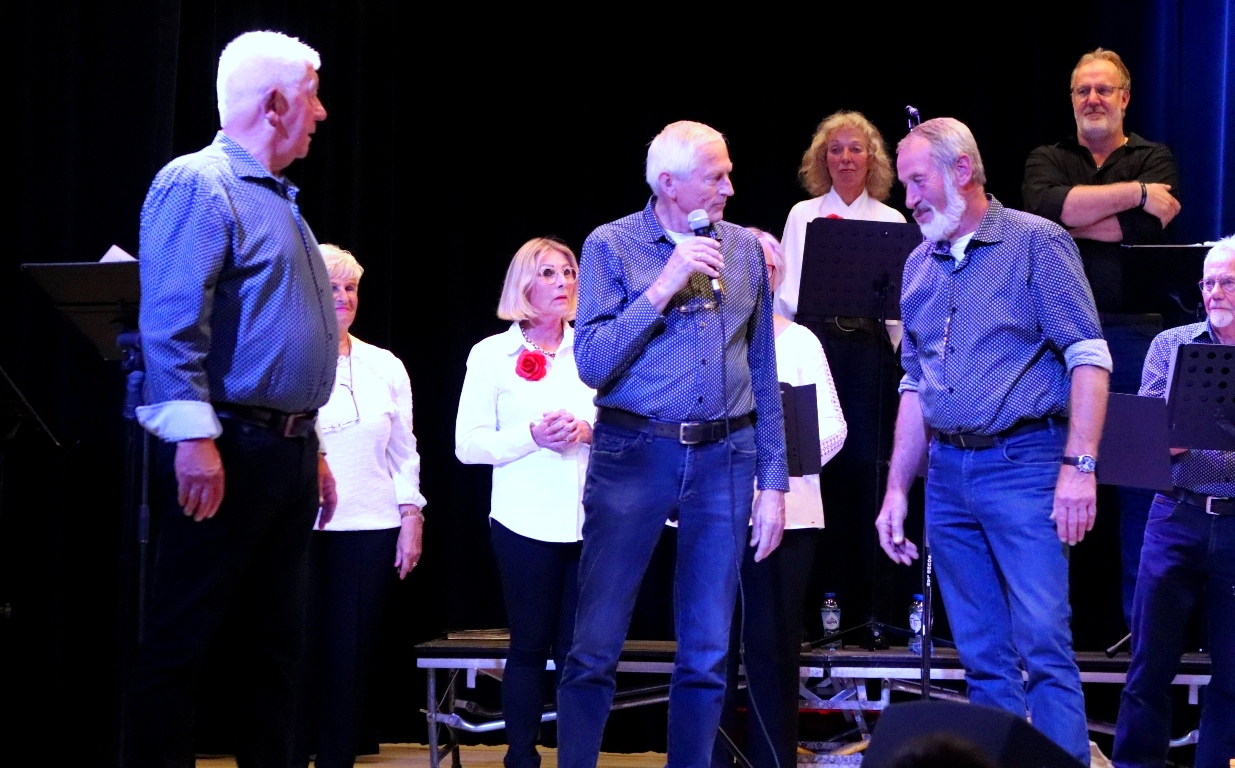 Hierna werden mensen in het zonnetje gezet. De voorzitter Bouke Zijlstra riep koorlid Kor Kloppenburg naar voren die al 25 jaar lid van het koor was. Hij kreeg een luxe zuivelmand overhandigd. Ook Geert Dijkstra werd bedankt voor zijn grote inzet voor het koor en de Jubileumactiviteiten. Als speaker had Geert Dijkstra het slotakkoord.