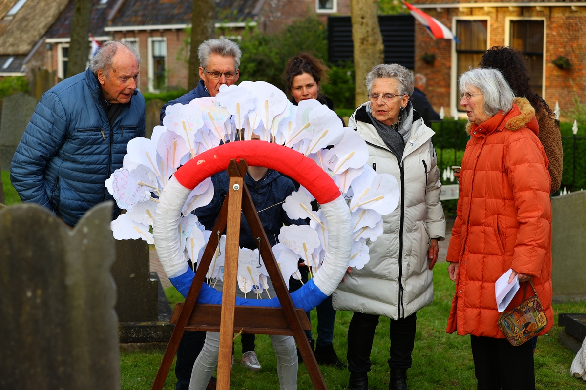 IE – ”Leven met oorlog/de droom van dr. Jarl Ruinen”. Omstreeks 19.45 uur las Rigtje Borger een indrukwekkend verhaal voor. Tijdens de herdenking legden leerlingen van C.B.S “De Gearing” een bloemstuk bij het graf van Dr. Ruinen, Gerike en Anna Jeltje lazen een gedicht voor en daarna vulden de kinderen een krans met “droomwolkjes”, waarin ze vertellen wat vrijheid voor hen betekent. O.a. vrede, liefde, geen oorlog, geloof, hoop en geluk.