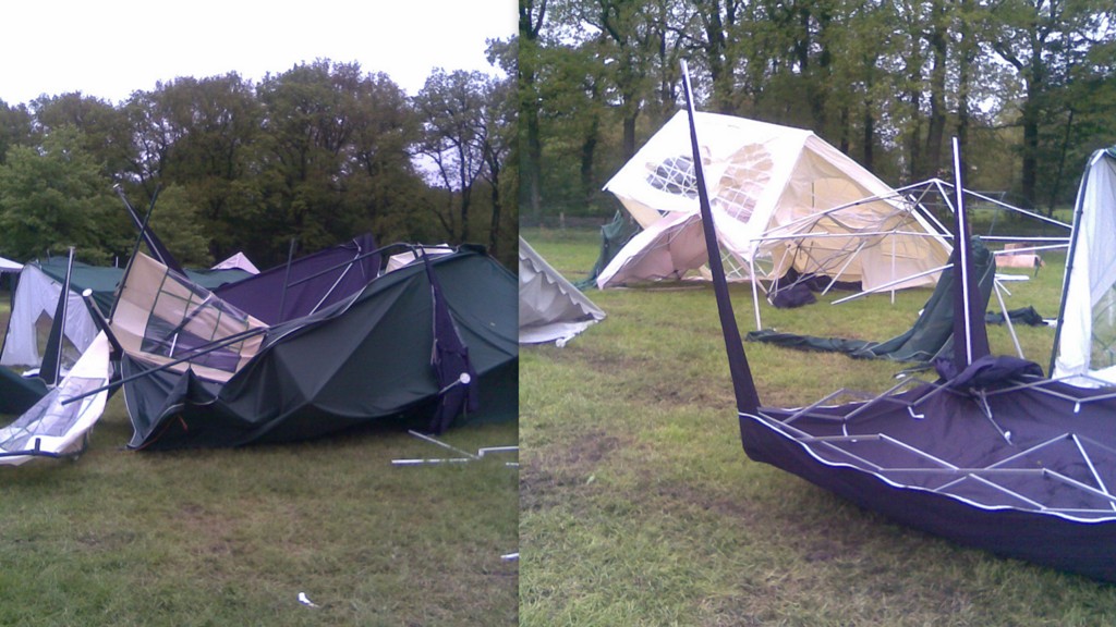 Woensdag rond kwart voor zeven ontdekte penningmeester Leo Algra een grote ravage aan op het pinksterterrein in Veenklooster. Omdat de kunstenaars-tenten nog waren blijven staan in verband met de regen van afgelopen dagen konden deze niet opgeruimd worden. De stevige wind heeft daardoor afgelopen nacht vrij spel kunnen spelen met de nog aanwezige tenten.