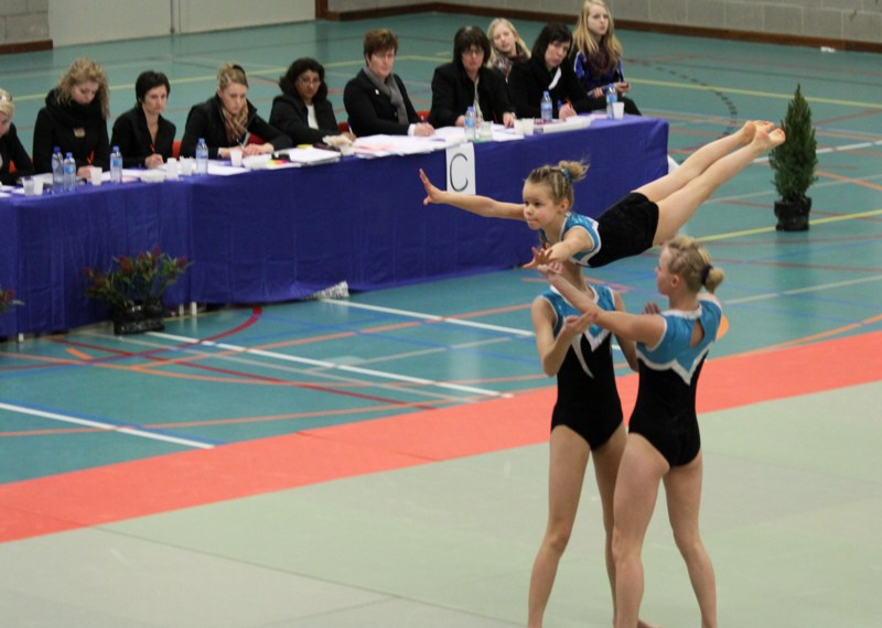Instap E. Dit is een categorie voor beginnende acroteams in de leeftijd van 6 tot 12 jaar. Twee trio’s van deden mee in deze klasse en niet onverdienstelijk. Demi Braam, Ilse Alkema en Femke Postma behaalden met 25,90 het zilver. Maaike Weidenaar, Noami Jongeling en Simone Veenstra kregen voor hun oefening 25,43 welke goed was voor brons. Junioren E. Vanaf deze categorie zijn er landelijke wedstrijden en was er naast de podiumplaatsen doorstroming naar het FK mogelijk. De leeftijd van de acrogymnasten is van 8 /m 13 jaar.