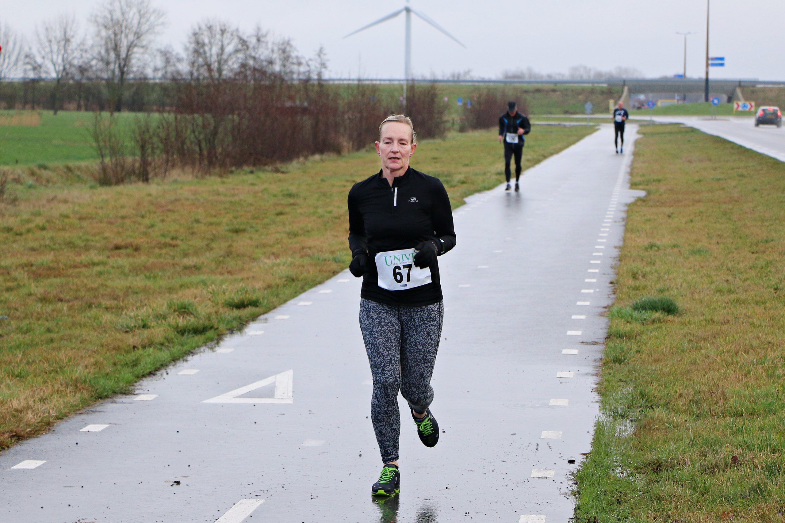 De weersvoorspellers hadden het al aangegeven en Simone Scheffer van Omrop Fryslân kondigde ’s morgens al aan er kon ook nog wel een waterig zonnetje gaan schijnen. En ze had gelijk maar de meeste tijd was het nat en erg winderig wat de organisatie deelnemers kostte, ook de trail in Appelscha trok deelnemers die anders wel in Dokkum zouden hebben gelopen. Zo komen er steeds meer loopevenementen bij op de kalender www.hardlopendnederland.nl en wordt de spoeling wat dunner, maar voor 223 mannen en vrouwen was het fijn dat deze loop er was en hebben ondanks het minder mooie weer genoten van de mooie route goed uitgezet en veel verkeerregelaars met onderweg voor de 10 mijl een verzorgingspost met warm water en na de finish hete bouillon, thee, vruchtendrank en fruit.