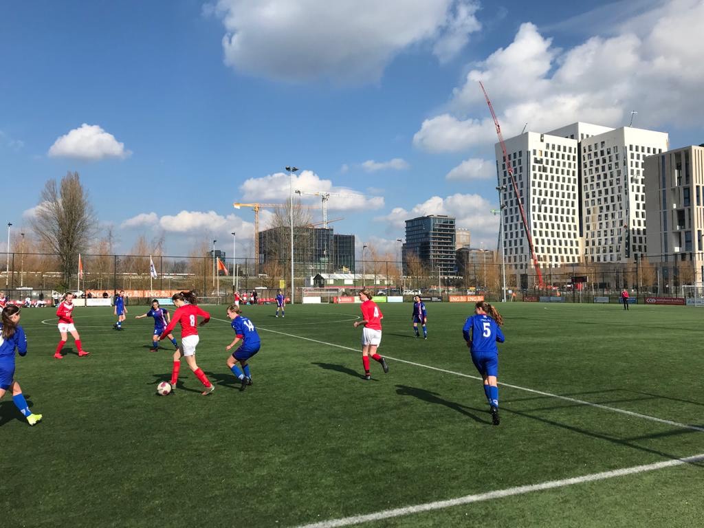 “Erg jammer dit, de meiden hebben keihard gewerkt. De 1ste helft hadden we een veldoverwicht maar waren we niet doortastend genoeg in onze acties. De 2de helft waren we dat wel echter gaven we vandaag 2 onnodige doelpunten weg. Het is jammer dat het hierbij niet de verdienste van de tegenpartij was maar dat we het zelf waren die Buitenveldert in het zadel hielp. Gezien het veldspel met name op het middenveld was het een terechte uitslag. Desondanks hebben we toch door die tegendoelpunten 2 punten laten liggen. Maar goed we hebben wel weer een leuke dag met elkaar beleefd, staan nog steeds 2de in de Landelijke Competitie en zeg nou zelf wie maakt dit nu eigenlijk allemaal mee in het meidenvoetbal, voetballen tussen de wolkenkrabbers op een prachtig hoofdveld in onze hoofdstad?