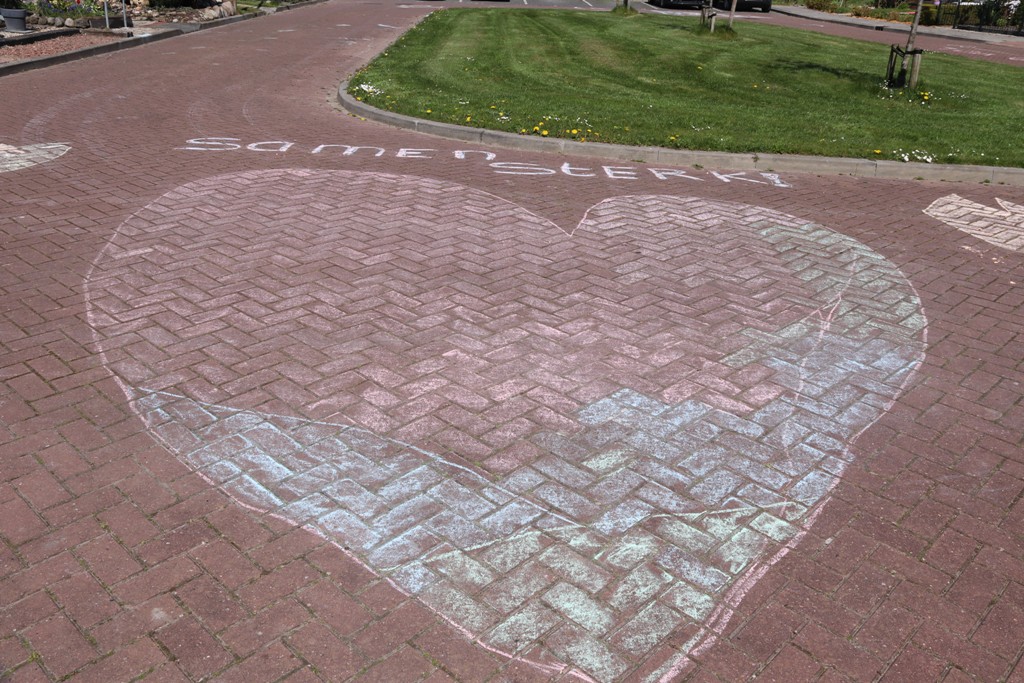 Nu zijn de kinderen zwaar teleurgesteld, ze hadden zo hun best gedaan met stoepkrijt. Ze hebben daarom wel een plekje verdient op de site van RTV NOF zodat iedereen hun goedbedoelde opsteker kan bekijken.