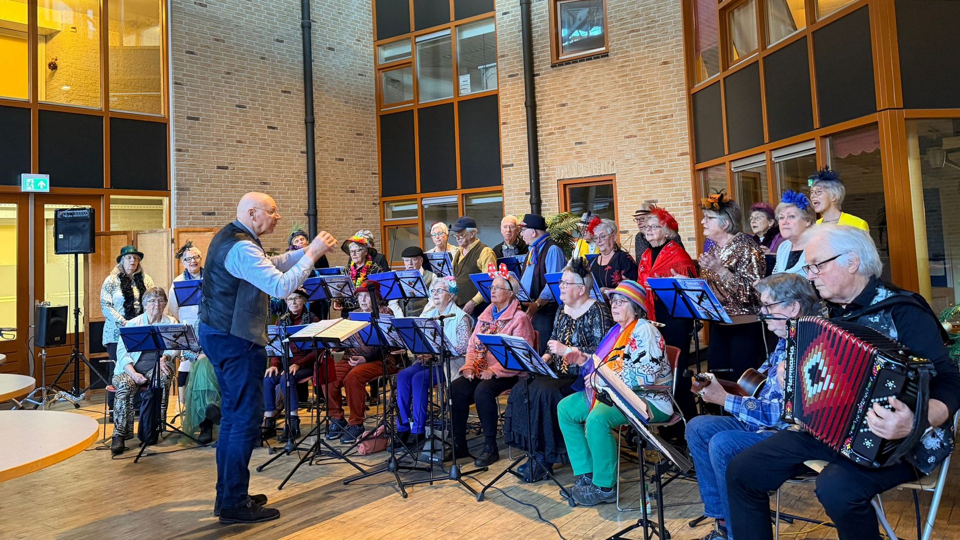 Ondanks sneeuw en gladde wegen waren vrijwel alle koorleden aanwezig! Wat een opmerkelijke liefde voor het koor en een sterke teamgeest. De afdeling Welzijn van Berchhiem had de grote zaal in gereedheid gebracht om een groot aantal bewoners te verwelkomen met tussendoor een hapje en een drankje.