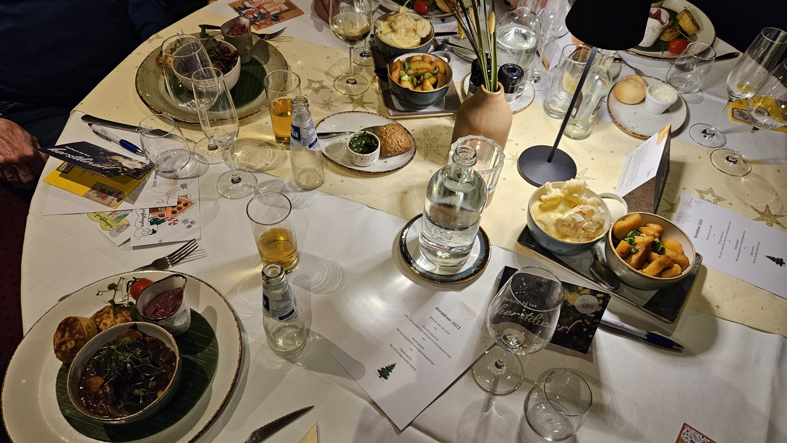 Er werd begonnen met een lied passend voor deze avond: komt allen tesamen. Waarna het tijd was voor het eten, waarbij de aanwezigen werden getrakteerd op heerlijke gerechten: een amuse van de chef, tonijncarpaccio, hazenpeper en tarte tartin. Dit geheel werd natuurlijk in stijl opgediend en vergezeld met de menige drankjes, met of zonder alcohol, wat men maar wilde hebben. Verschillende liedjes, zowel kerst als ook oude bekende liedjes, werden ten gehore gebracht en de aanwezige mensen zongen zelfs luidkeels mee. Men ging zelfs zittend swingen. Kortom, de sfeer zat er goed in.