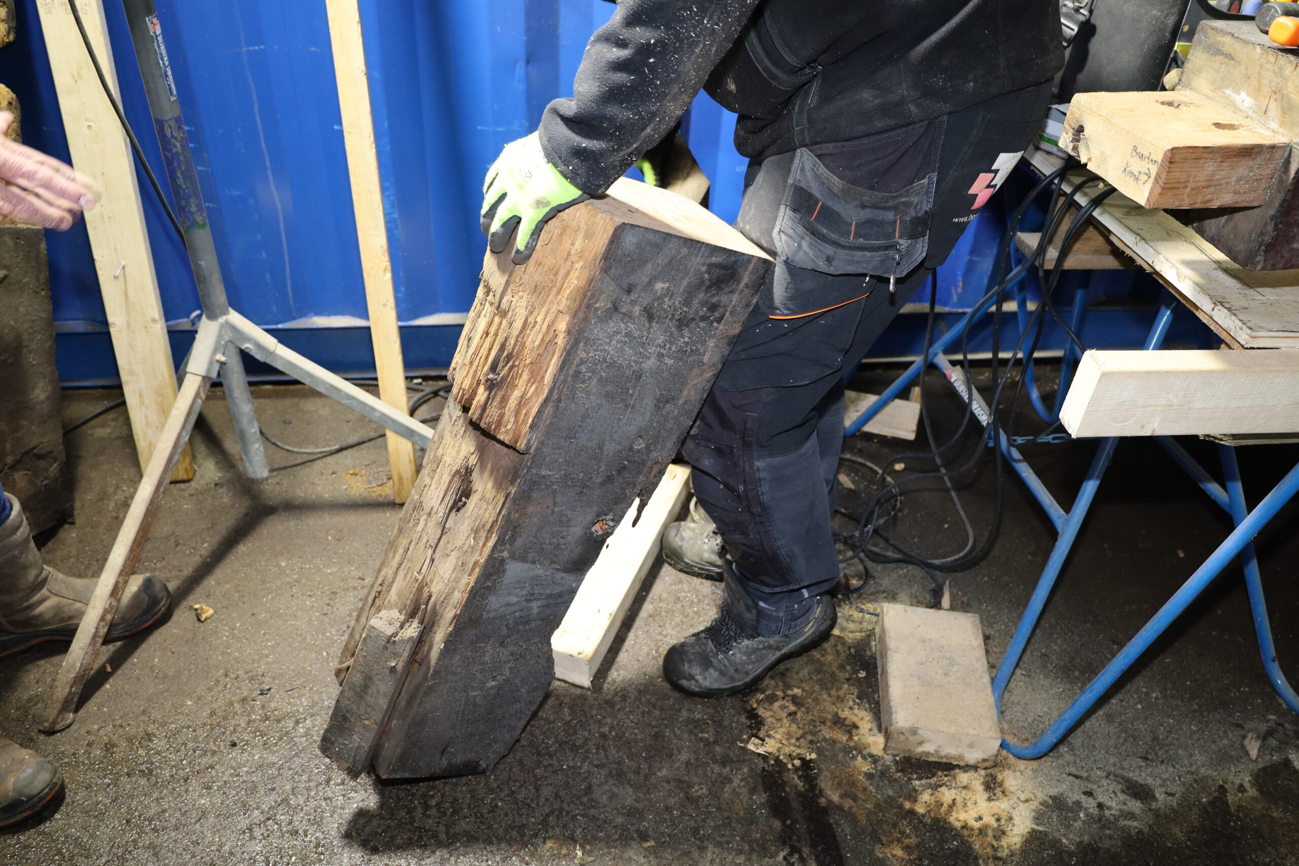 De pop-up werkplaats, speciaal ingericht voor deze klus, staat op het terrein van transportbedrijf Feenstra. De gebinten zijn opgeslagen op het terrein en worden één voor één opgeknapt. “Wy ferwachtsje dat wy oan it reparearjen fan dy bynten likernôch 10 oant 12 wiken wurk te hawwen”, vertelt Durk van der Zee van Dijkstra Draisma.