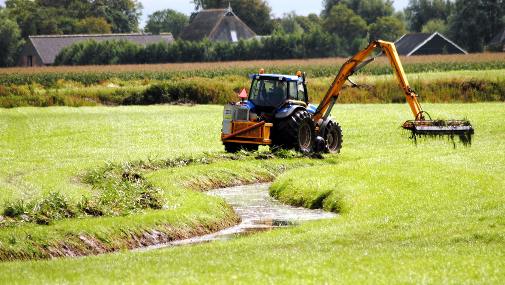 Boeren hekkelen met een hekkelbak aan een kraan of trekker de sloten weer vrij van riet en andere waterplanten, om de water aan- en afvoer weer te optimaliseren.