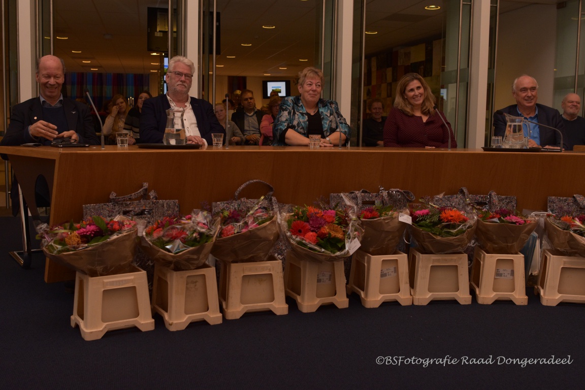 Naast de Raad werden de aan de raad gelierde ambtenaren in het zonnetje gezet, zo werden de griffie en de bodes bedankt voor hun inzet. Er werd in de toespraak van Inne Bilker richting de bodes geopperd om de enkele vergaderzalen te vernoemen naar Klaske, Wiebe en Simon van de bode dienst. Dit voorstel werd als motie ingediend en ondertekend door alle aanwezige partijen. Ook de commissie leden werden bedankt, Fedde Breeuwsma mocht vervolgens het woord richten aan het college, in zijn woord werd duidelijk dat we nog niet van de leden van het college Dongeradeel af zijn. Er worden drie beelden gemaakt op de zeekering bij Holwerd waar in de beeldengroep wachten op hoog water Albert van der Ploeg en Pytsje de Graaf worden verbeeld. Esther Hanemaaijer wordt als Dijk van een Wijf verbeeld. Hier werd door de aanwezigen hartelijk om gelachen. De raadsleden werden vervolgens een voor een door middel van een toespraak bedankt voor hun inzet in de raad van Dongeradeel. De inzet werd beloont met een bos bloemen een foto en tekening van de raadsleden.