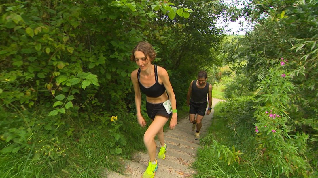 Waar de wedstrijd zaterdagmiddag in de stralende zon begon, kwamen de laatste lopers zondagmiddag binnen in de stromende regen. Van de 79 lopers die aan de start stonden, waren er bij de laatste ronde nog zes over. ‘Makkelijk, twee vingers in de neus’, zegt Schokker terwijl ze de Kardingebult zondag voor de zoveelste keer op loopt. ‘Maar het laatste rondje is het pijnlijkst.’ En ook een ander heeft de moed er nog in: ‘Gaat lekker hoor! Maar, na 142 kilometer wordt het wel wat minder. Nog drie rondjes en dan zitten de honderd mijl erop.’