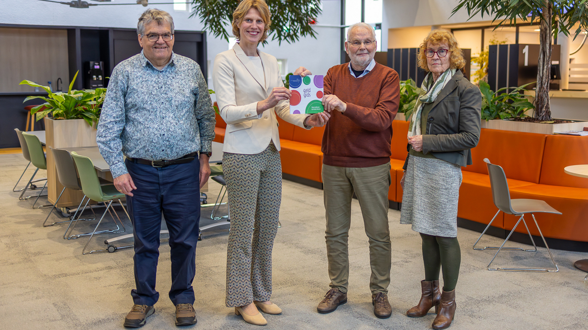 Bijschrift foto: Wethouder Caroline de Pee overhandigt de geldgids aan dhr. van Dijk, dhr. Elzinga en mevr. van Dellen van Humanitas. De geldgids is een uitgave van de gemeente Tytsjerksteradiel.