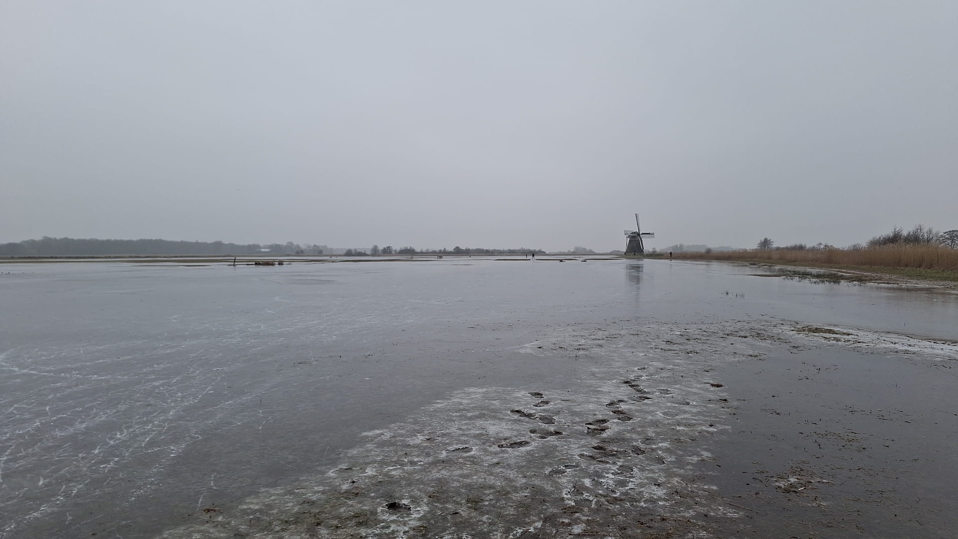 Schaatsers op ondergelopen weilanden