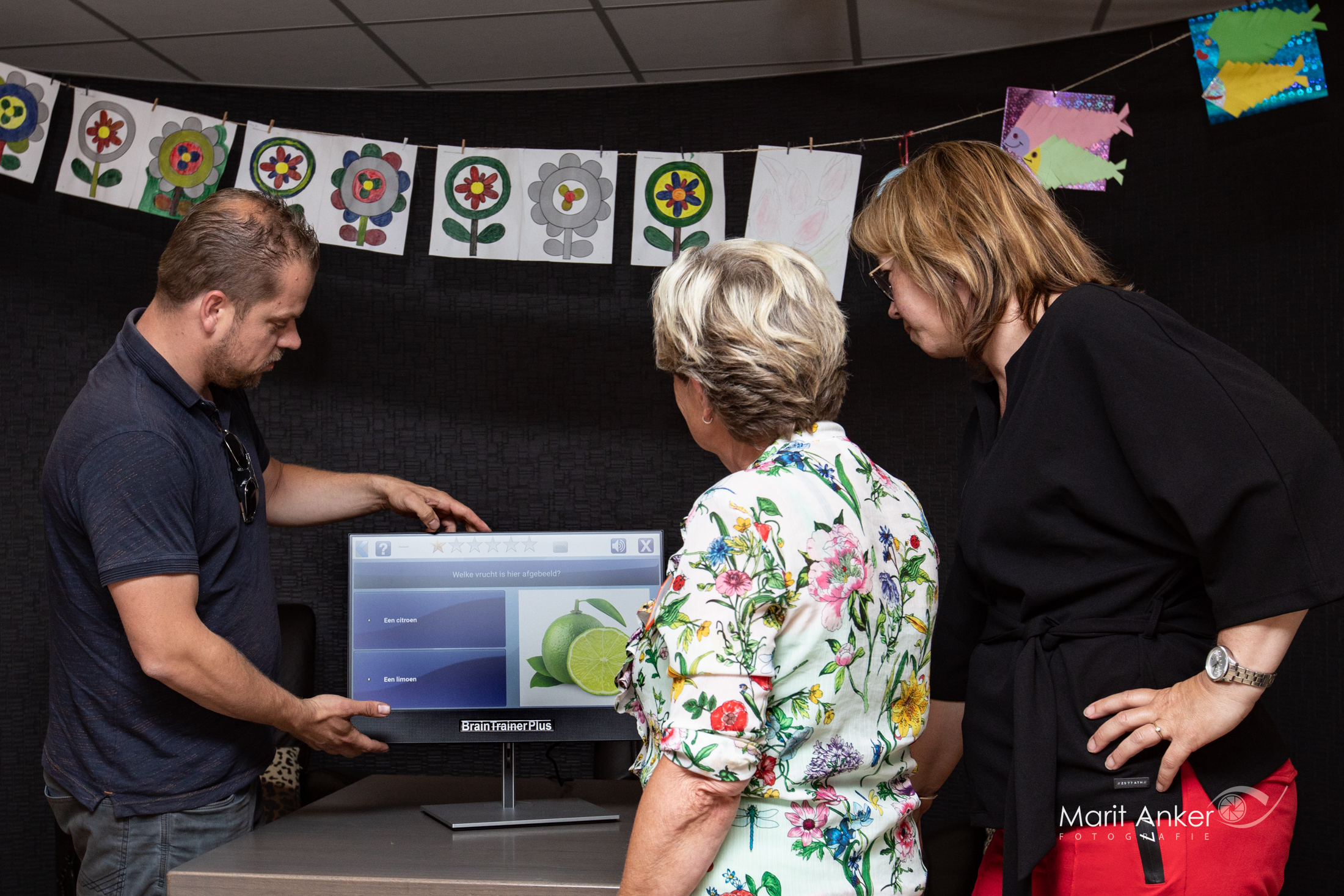 DOKKUM – Herinneringen ophalen, het denkvermogen stimuleren met quizzen, samen naar muziek luisteren, samen zingen, dansen of bewegen op de muziek; in de Waadwente kan dat nu met de Braintrainer. Een tijdje geleden bracht stichting Ik ben Wil dit stukje technologie in het verzorgingshuis, samen met Jurgen Menkhorst van BrainTrainerPlus™. Er wordt op de dagbesteding inmiddels dankbaar gebruik van gemaakt! De vraag naar een Braintrainer kwam bij Stichting Ik ben Wil terecht na een ontbijtsessie met Zuidoost Zorg. De stichting kon dit mogelijk maken door de vele gelden van particulieren en ambassadeurs waar ze jaarlijks op kunnen rekenen.