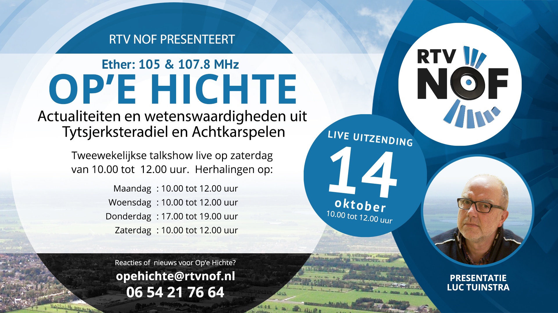 Live uitzending: zaterdag 14 oktober van 10:00 tot 12:00 uur. Ontvangst via FM 105 en 107.8 en online via www.rtvnof.nl Herhaling op radio: maandag, woensdag en zaterdag om 10:00 uur en donderdag om 17:00 uur. Ook te beluisteren op www.rtvnof/gemist.