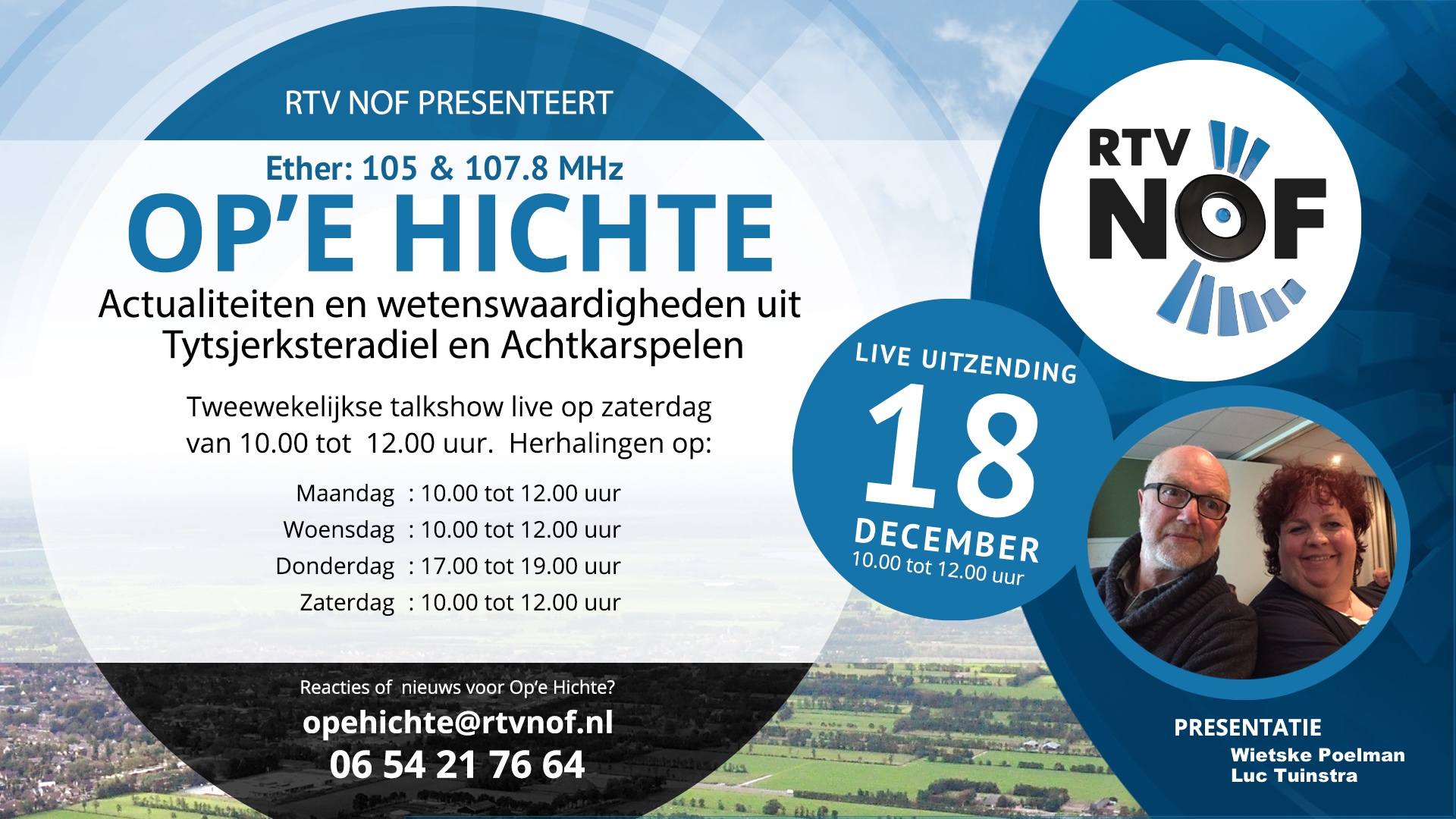 Tot slot onze columnist Tjibbe Brinkman met zijn eigenzinnige kijk op het nieuws. Live uitzending: zaterdag 18 december van 10:00 tot 12:00 uur. Ontvangst via FM 105 en 107.8 en online via www.rtvnof.nl Herhaling op radio: maandag, woensdag om 10:00 uur en donderdag om 17:00 uur. Ook te beluisteren op www.rtvnof/gemist.