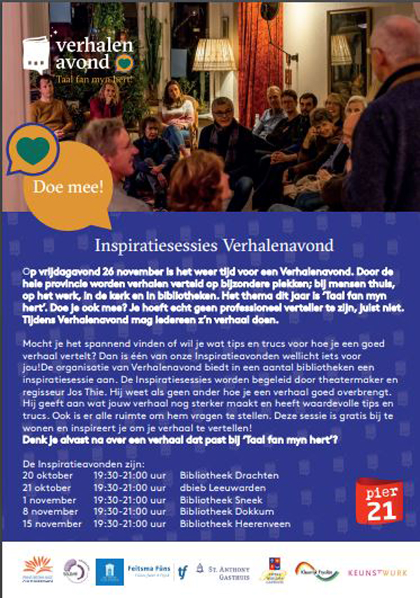 De gratis inspiratiesessie is op 8 november van 19. 30 – 21.00 uur in de bibliotheek van Dokkum. Aanmelden voor de sessie kan bij de Bibliotheek of via de website www.ontdekdebieb.nl/Activiteiten/verhalenavond-friesland