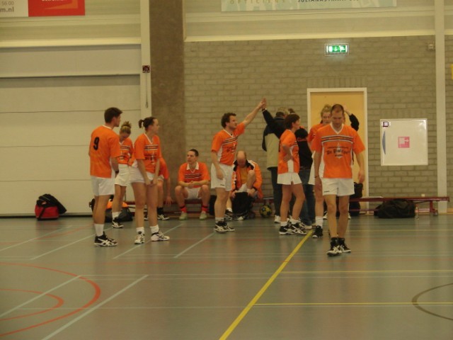 Hierop vond de scheidsrechter het weer nodig om cadeautjes uit te delen aan De Waterpoort, want door onder meer 2 strafworpen werd het met 10 minuten op de klok 16-9. De wedstrijd was gelopen, maar gelukkig bleven de oranje-hemden knokken het verschil niet te ver op te laten lopen. Om en om scorend werd een eindstand van 19-14 bereikt, wat geen schande is tegen de sterke koploper. De Waterpoort kreeg maar liefst 8 strafworpen mee (7 werden benut) waarvan zeker de helft zeer discutabel was. Of er anders meer in had gezeten is de vraag, maar het blijft wrang, aangezien Invicta zeker in de tweede helft De Waterpoort prima partij bood. Wie weet wordt er volgende week in de laatste thuiswedstrijd van het seizoen gestunt tegen Ritola.