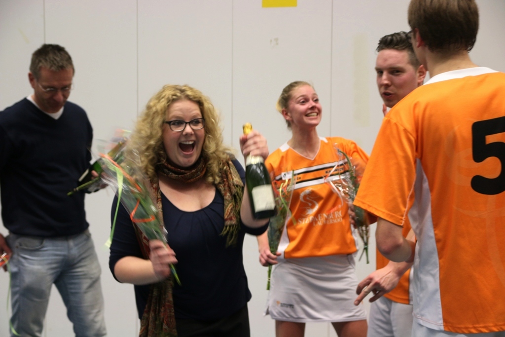 Na het in ontvangst nemen van een bloemetje, het eten van taart en een mooie overwinning van het eerste werd het feestje opgezocht. De overwinningen van de dag werden gevierd onder het genot van een hapje, een drankje en leuke muziek. Ondanks dat het kampioenschap al binnen is voor het combinatieteam moeten er nog 3 wedstrijden gespeeld worden. Ook bij deze wedstrijden is al het publiek natuurlijk van harte welkom om ons naar een ongeslagen kampioenschap te juichen! Eerstvolgende wedstrijd wordt 11 februari om 14.15 in de van der Bij hal in Kollum gespeeld. Wees welkom!