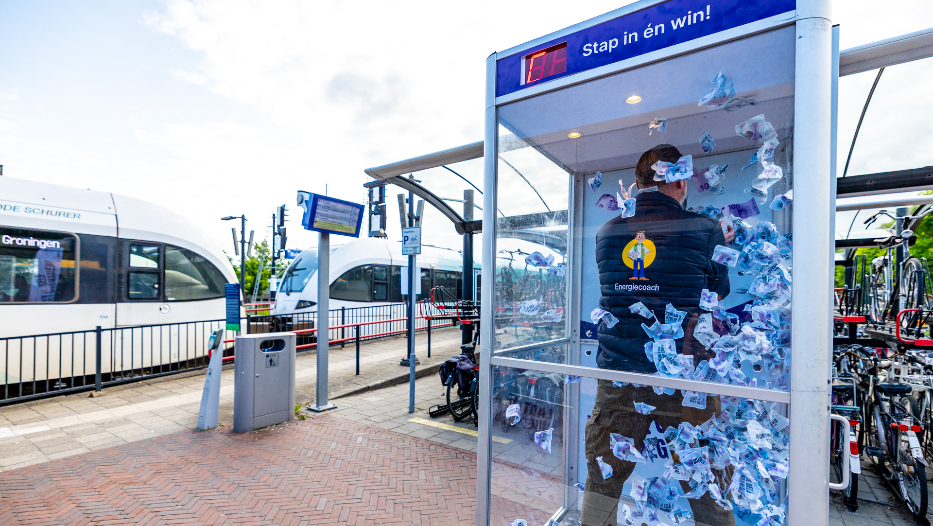 BUITENPOST – Grijpen naar geld om je huis te isoleren? Dat kon maandagochtend 2 juni op station Buitenpost. De isolatiecampagne ‘Laat je geld niet wegwaaien’ werd op een opvallende manier afgetrapt: met een ‘moneybox’. Wethouder Boerema stapte als eerste in de doorzichtige cabine waarin symbolisch geld rond wappert en gaf daarmee het officiële startsein.