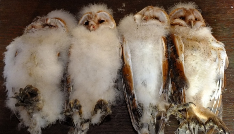 De 4 jonge kerkuilen, die 3 weken geleden een schoon nest hadden gekregen ,mochten weer even met een vrijwilliger naar beneden om daar gewogen, gemeten en geringd te worden en voorzover mogelijk werd het geslacht bepaald.