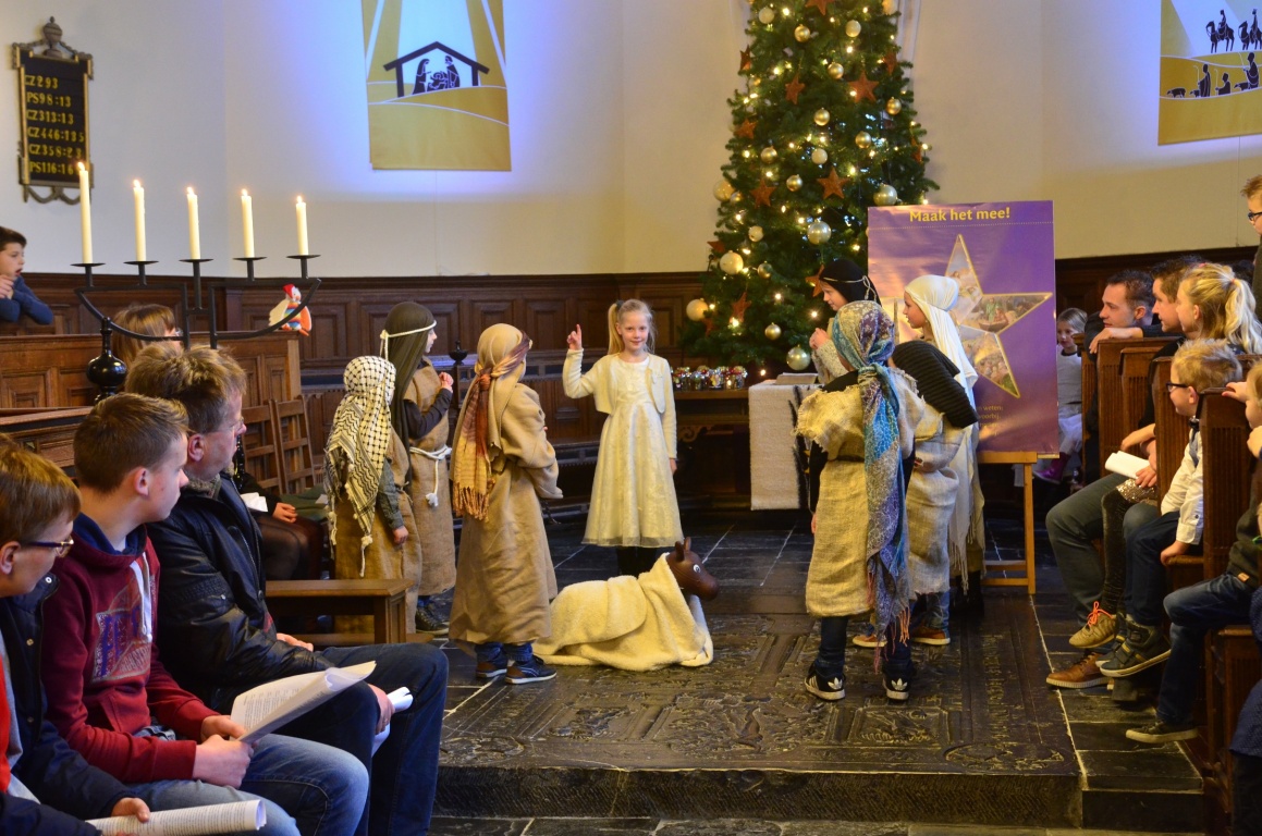 De kinderen beeldden uit dat de herders de geboorte van Jezus van heel dichtbij hebben meegemaakt. Het herderkoortje vertelde al zingend aan de mensen in de kerk wat ze hadden gezien in de stal. Zo maakten de mensen in de kerk het kerstfeest echt mee. Het was een gezellige dienst waarin de kinderen een bijzondere rol speelden met zang, toneel en instrumenten.