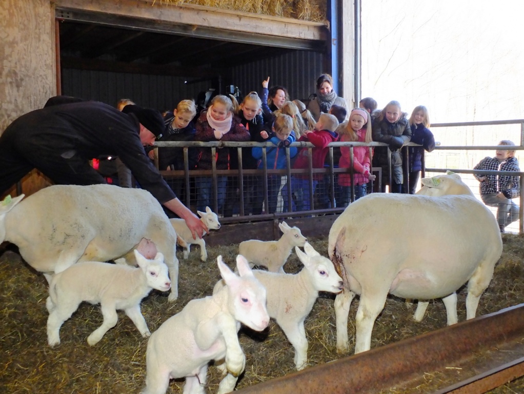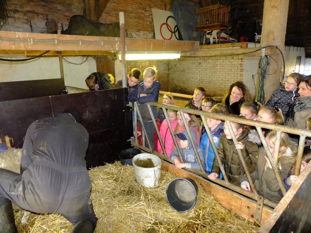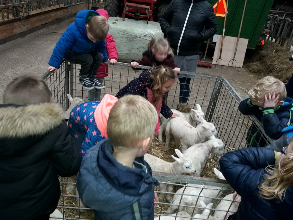 Voor veel kinderen was het best wel indrukwekkend, zoals het loeien van die grote koeien. Ze konden heel veel lammetjes, groot en klein bewonderen en aantal kinderen durfden een lammetje te aaien. De groepen 5 en 6 hadden geluk, want er moest net een schaap lammeren en van de boer mochten ze dat, als ze niet te veel lawaai maakten, wel even zien. En er was een lammetje, dat bijgevoerd moest worden, die kreeg de fles van stagiaire Geertje de Bruin.