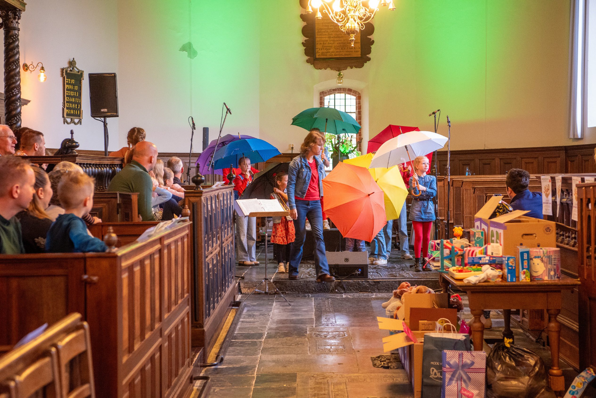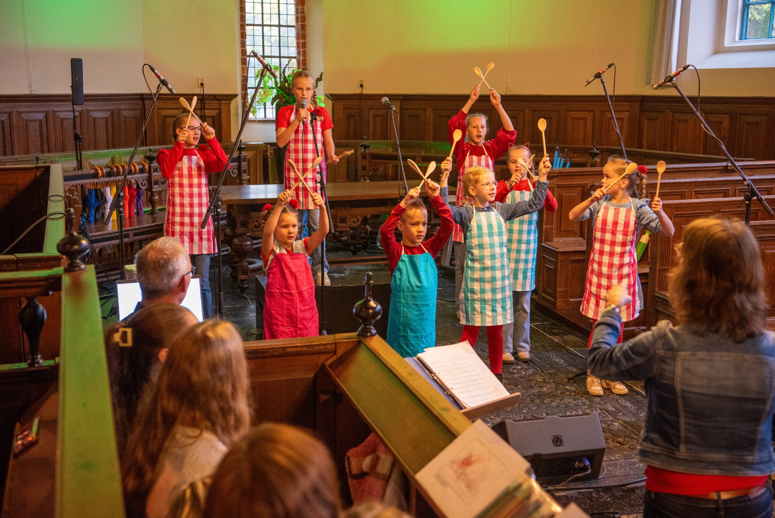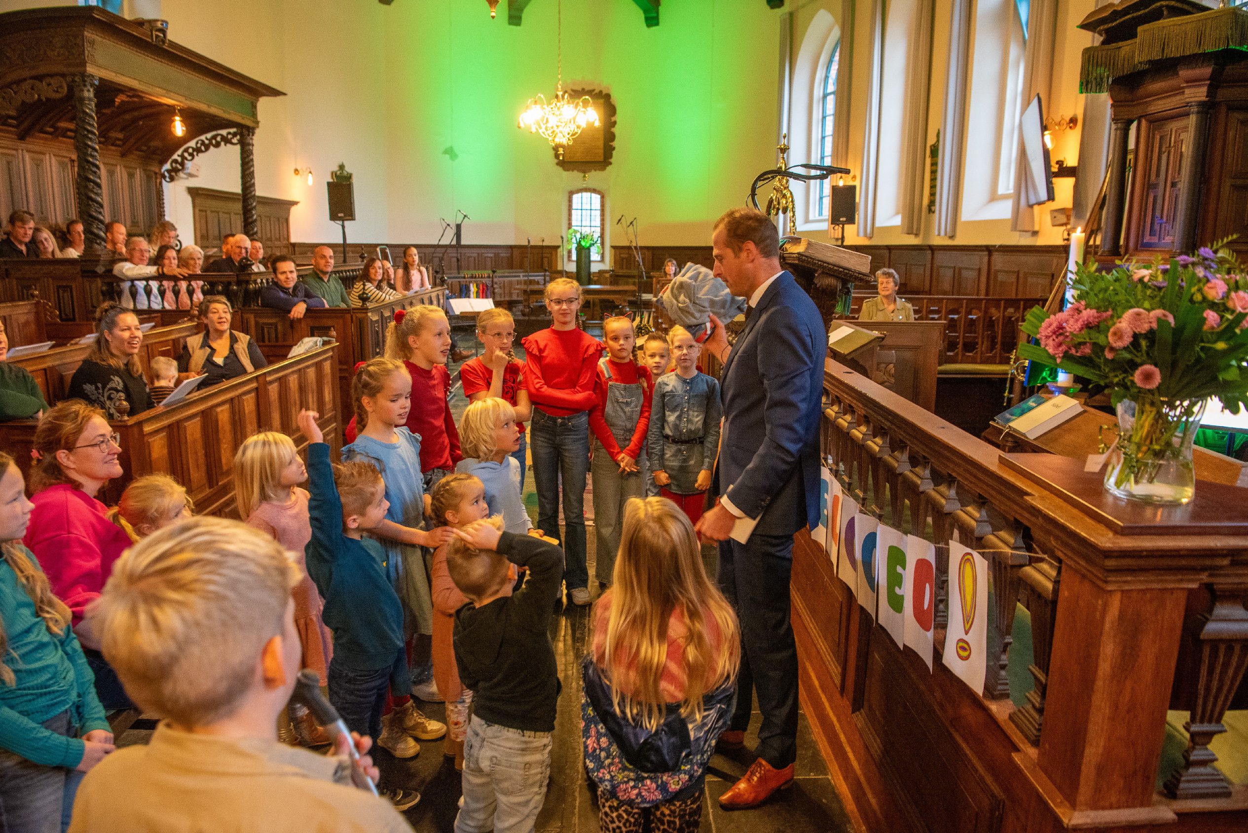 De gezellige dienst werd geleidt door dominee Wiebe Feddema en muzikaal omlijst door kinderkoor de Blide Sjongers.