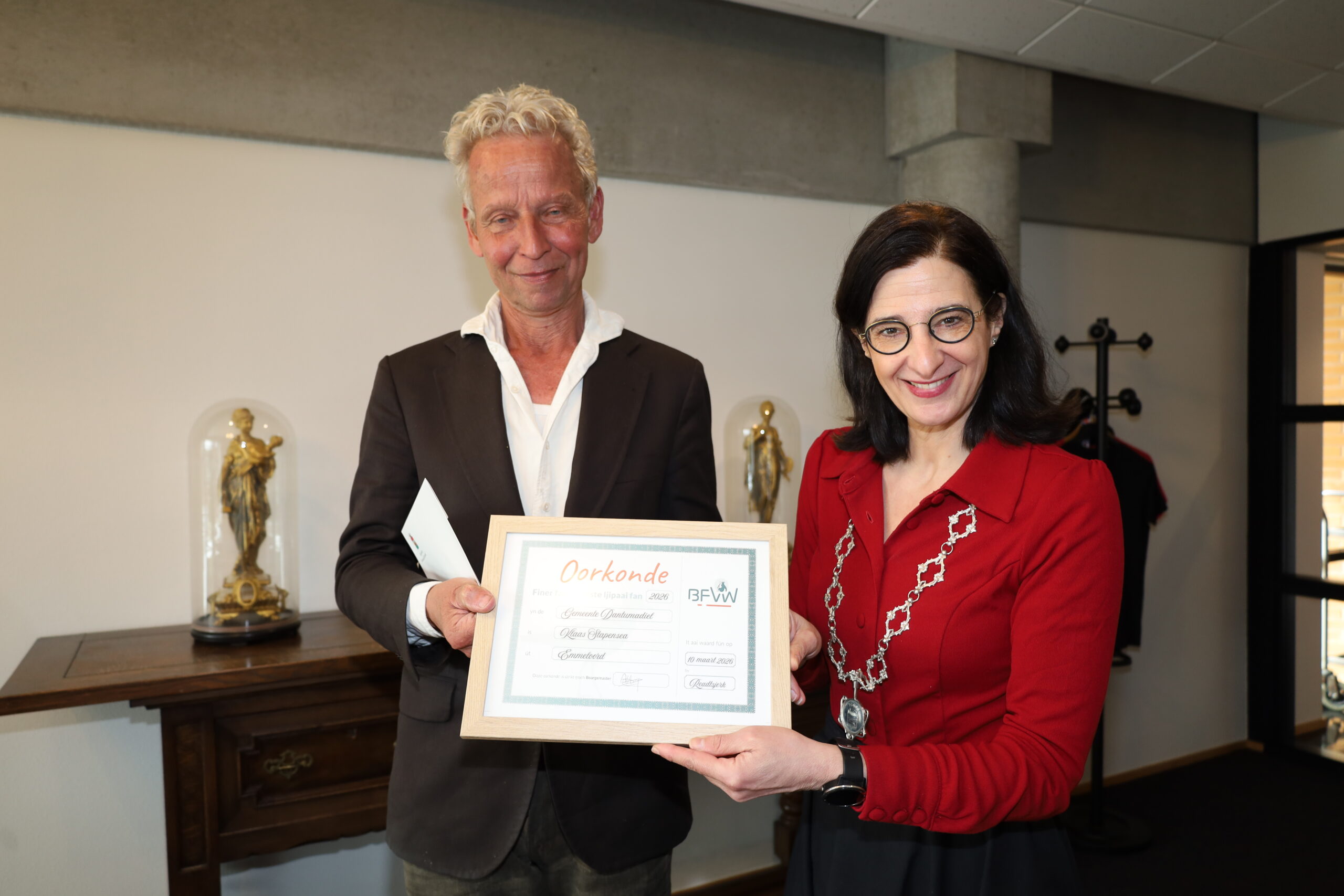 DAMWÂLD – Op donderdag 12 maart werd Klaas Stapensea uit Emmeloord in het gemeentehuis in Damwâld ontvangen door burgemeester Anja Haga. Stapensea vond afgelopen dinsdag 10 maart het eerste ljipaai van Dantumadiel in een weiland bij het Bûtenfjild in Readtsjerk.