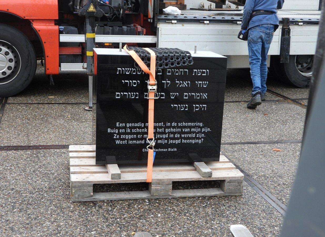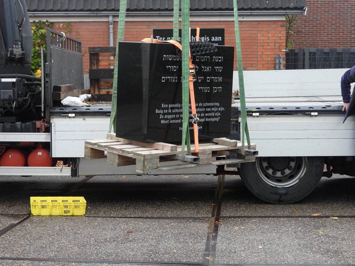 KOLLUM – Vrijdagochtend werd het nieuw gemaakte Joodse monument van Marcel van Zijp op een vrachtwagen getakeld vanuit zijn werkplaats in Kollum.