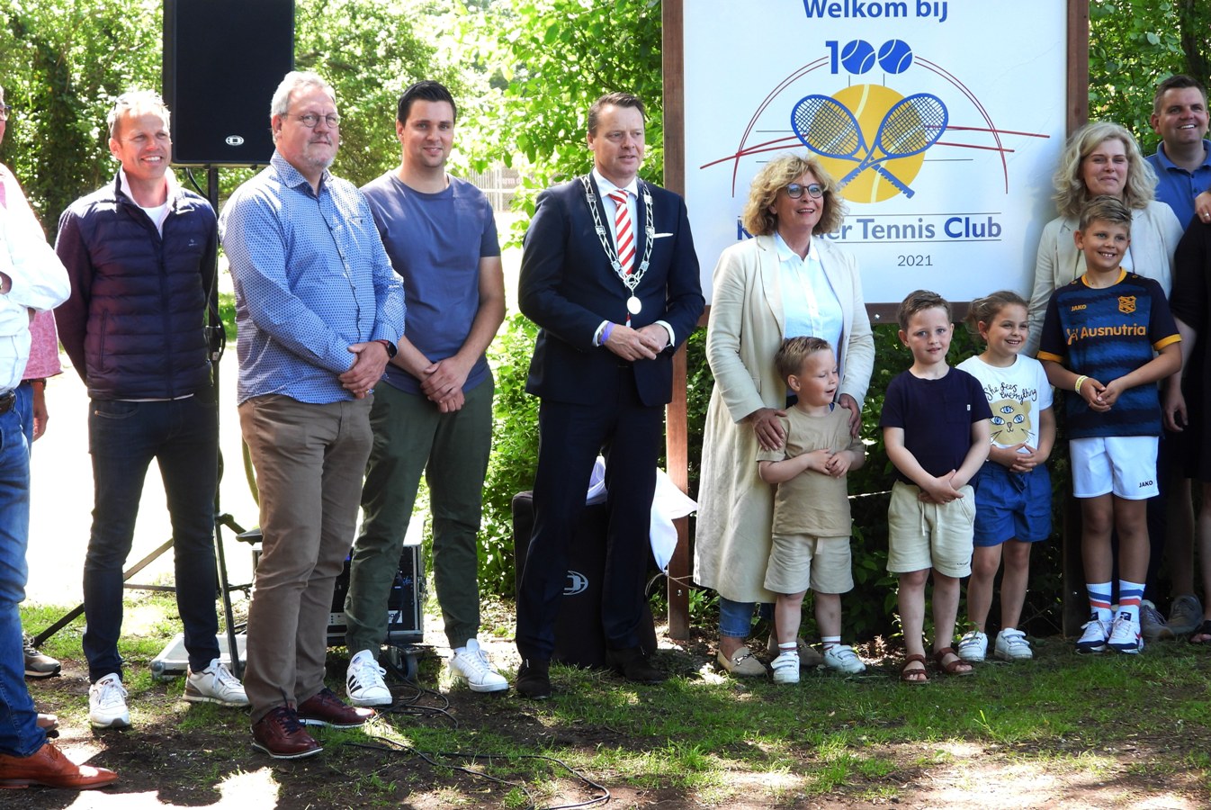 De reünie startte om 17.00 uur, er werd volop bijgepraat, dit was de gelegenheid om elkaar na vaak lange tijd weer te spreken. Om 18.00 uur nam voorzitter Dennis Gaasendam het woord op het terras onder de overkapping, waarna hij eerst het woord aan Christian Bessembinders van de KNLTB gaf. Vanuit de KNLTB werd er een prachtig muurschild aangeboden voor het 100-jarig bestaan van Kollumer tennisvereniging. Na het in ontvangst nemen hiervan ging voorzitter Dennis Gaasendam over tot het uitreiken van oorkondes aan twee ereleden. Erelid Harm van der Wal heeft zich tientallen jaren vol vuur ingezet om de club draaiende te houden. Letterlijk door eerst via de kantinecommissie voor het binnenkomen van gelden te zorgen. En later door als penningmeester ervoor te zorgen dat het over de hele linie in goede banen kwam.